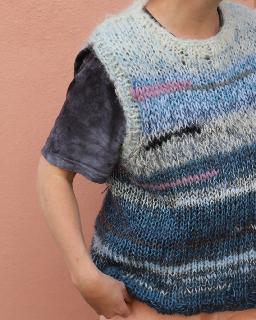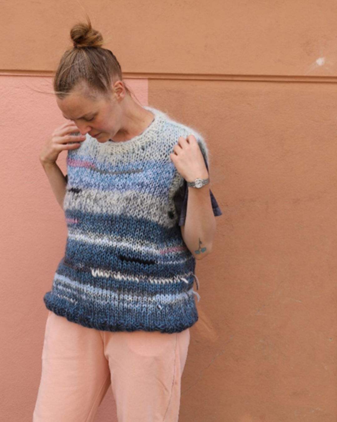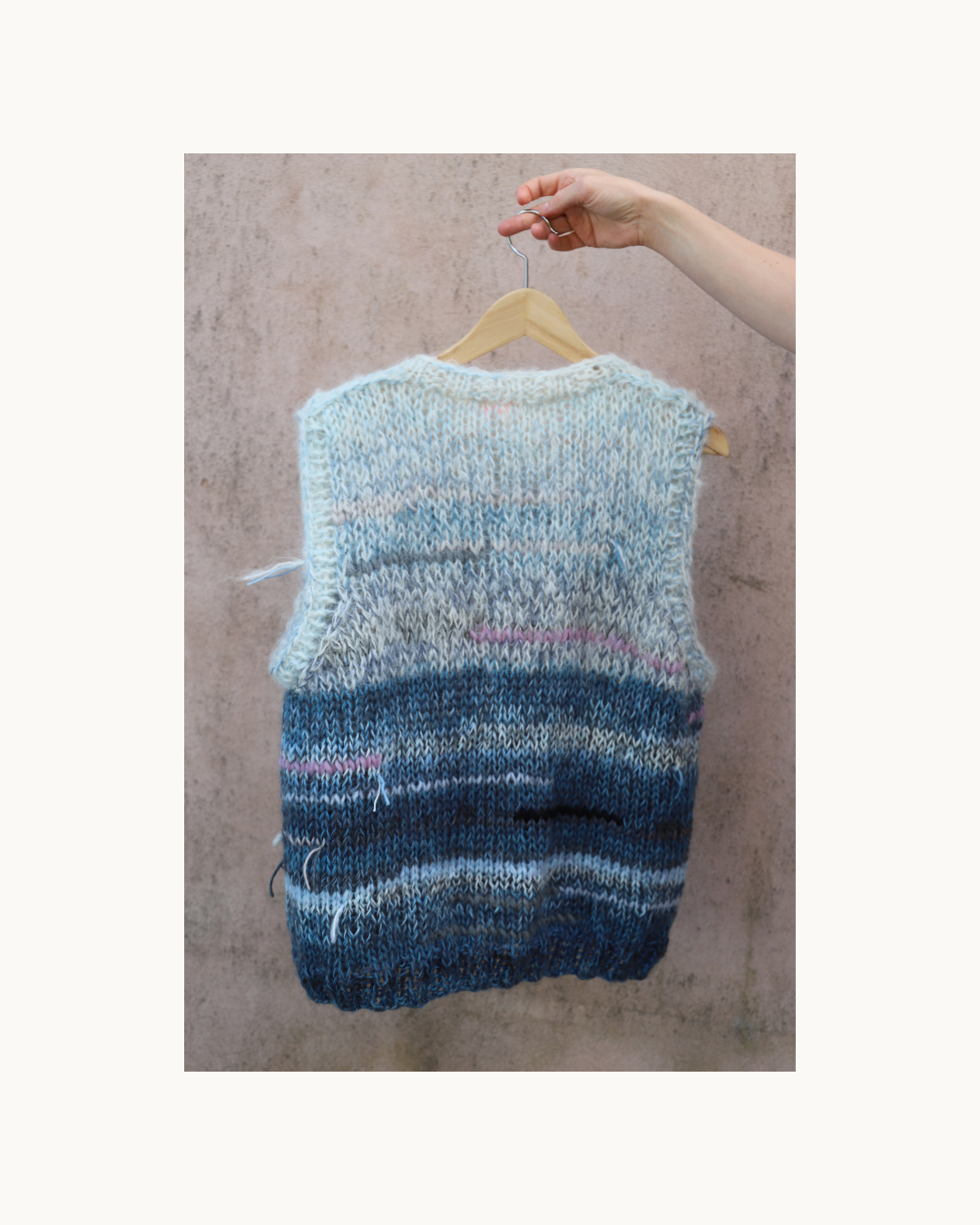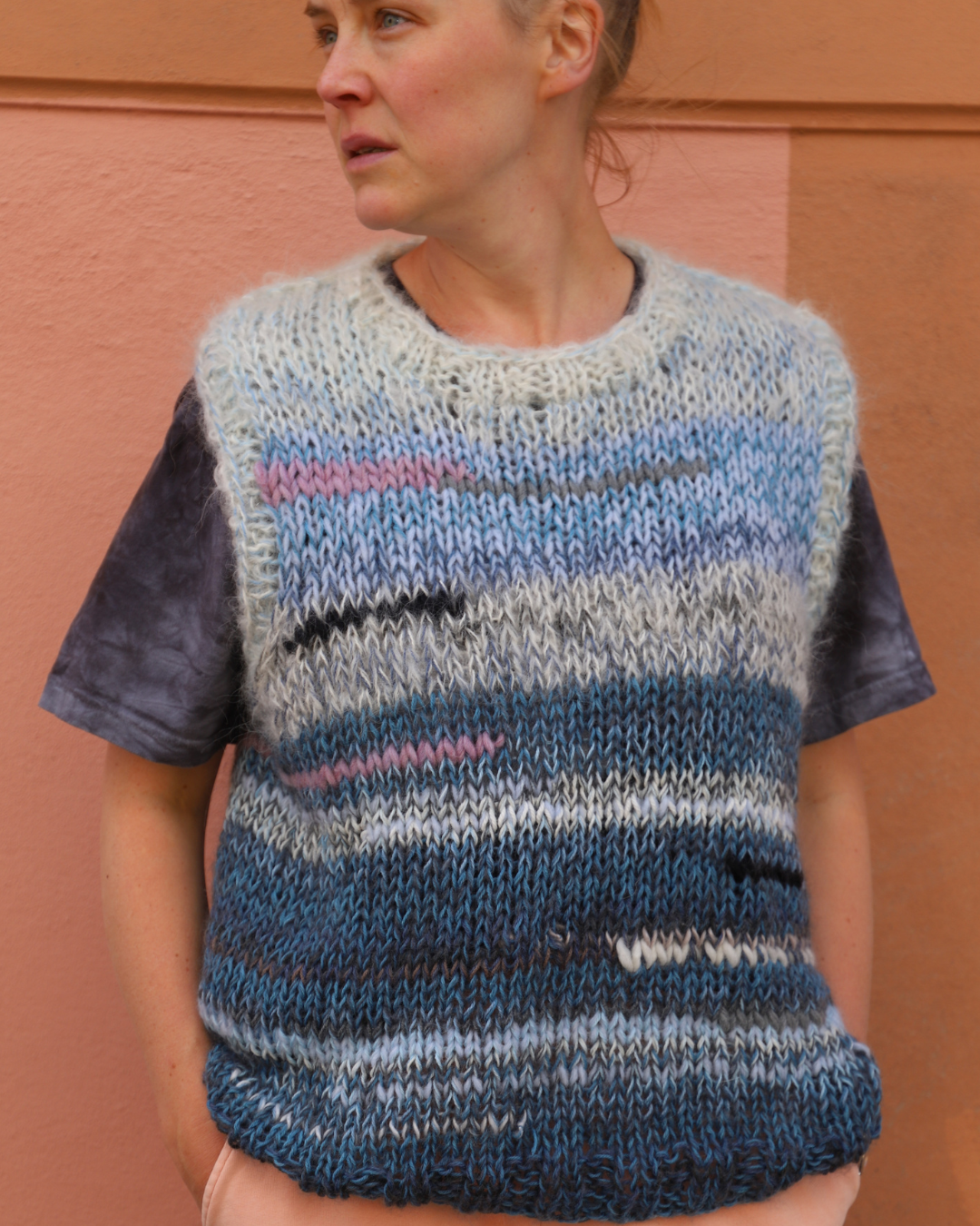 Vesten strikkes nedefra og op på pind 10 og 12 mm.