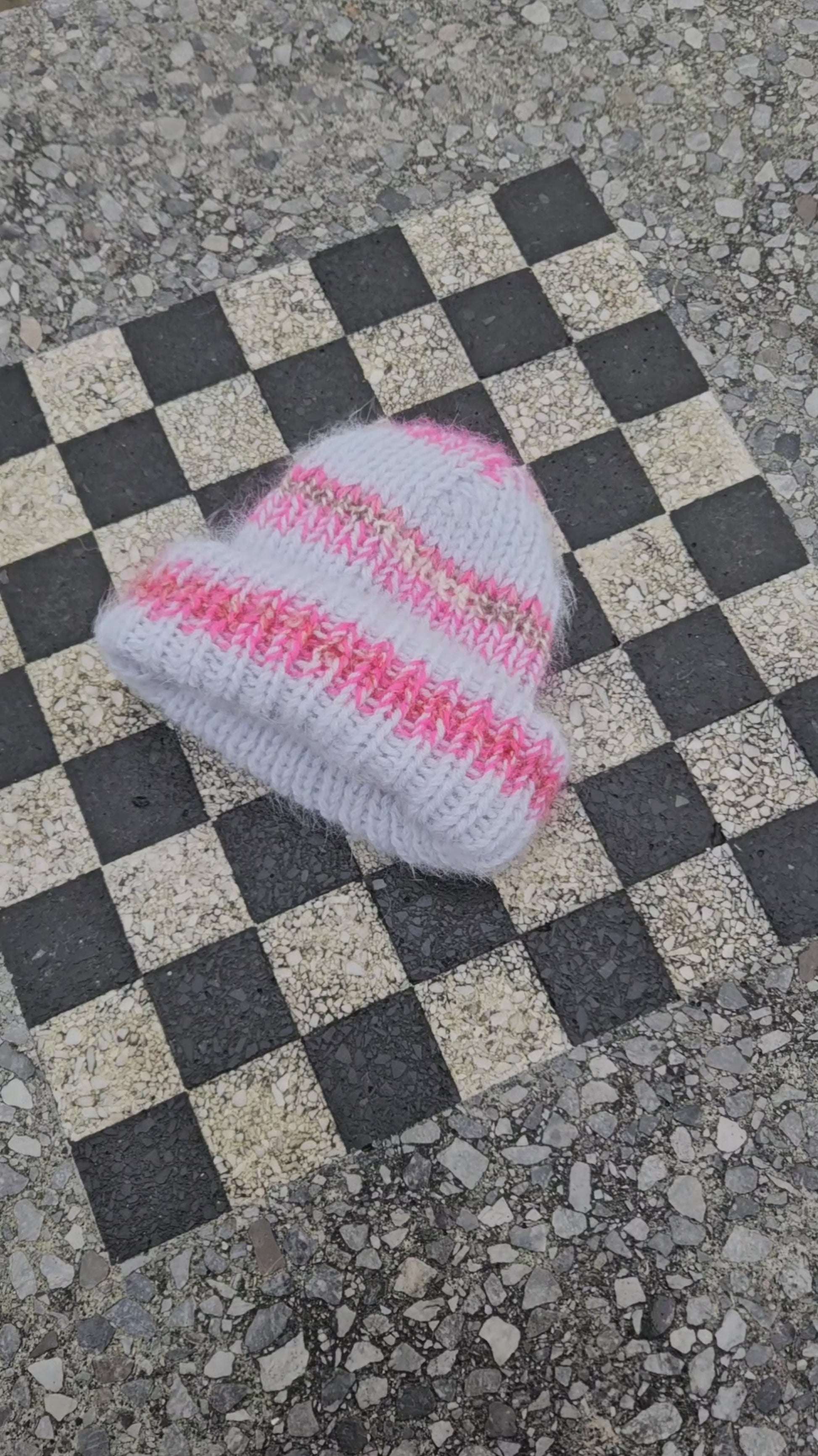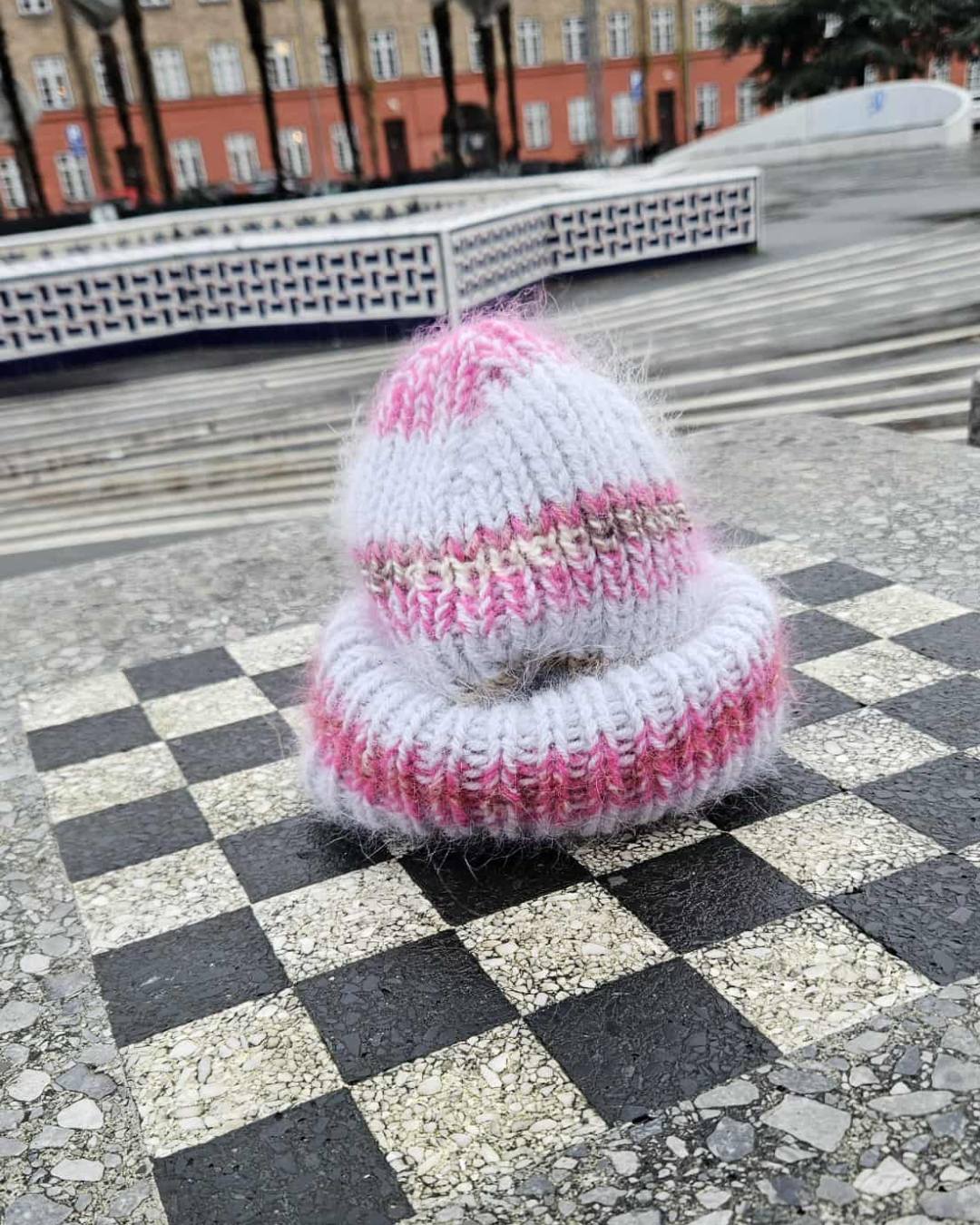 Jeg har strikket min hue i 1 tråd Angora garn fra Mondial + en tråd Double Sunday fra Sandness, samt et miks af garnrester. Jeg har strikket med 2-3 tråde af gangen.