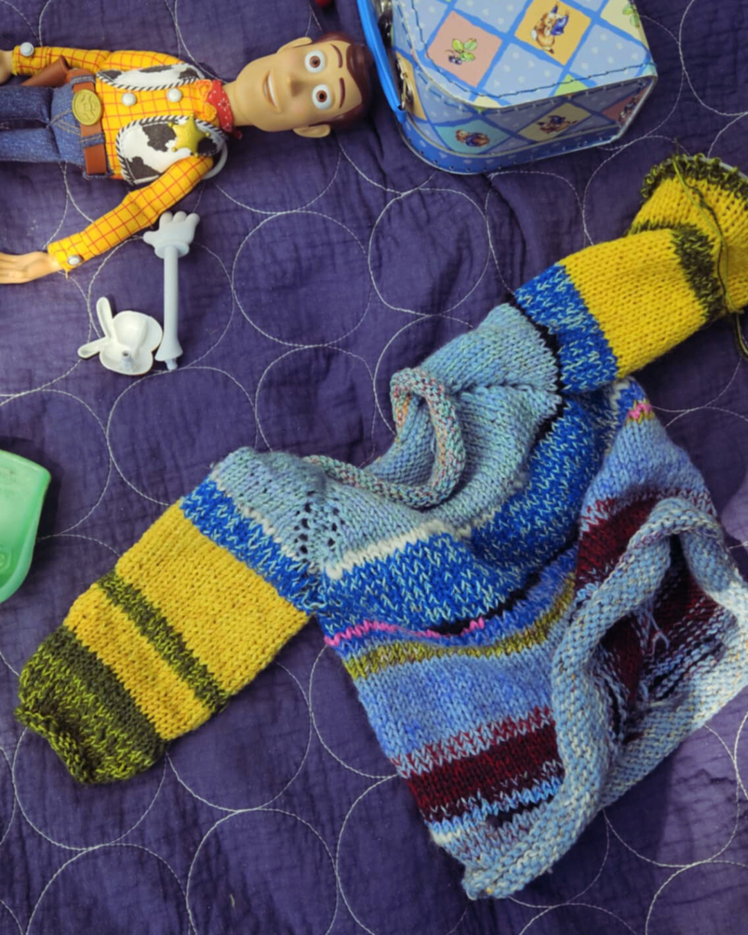 Jeg har lavet striber på hver 7. omgang og strikket 2 omgange i stribefarven.