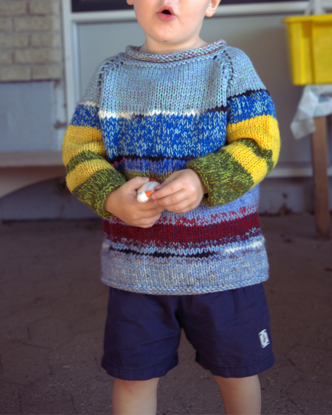 Jeg har strikket 2 begynderbluser til mine yngste børnebørn i rester af silke, uld og mohair. Jeg valgte modellen pga detaljerne i raglanen. Jeg er ikke begynder, men temmelig erfaren, jeg strikker blandt andet på bestilling til andre. Jeg ændrede halsen, så jeg strikkede ret efter opslaget og vendte arbejdet efter de 2 pinde, for at fortsætte i ret.
