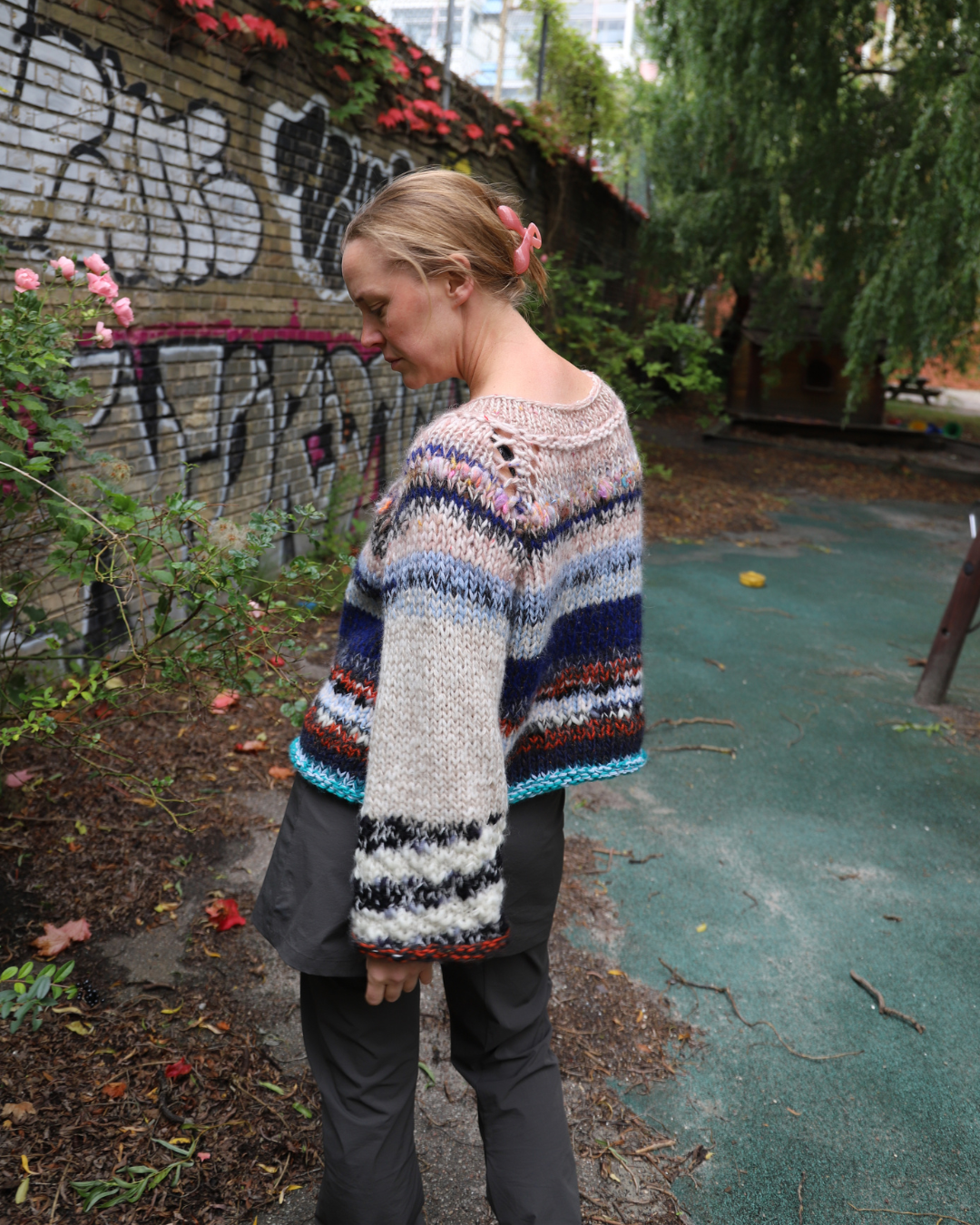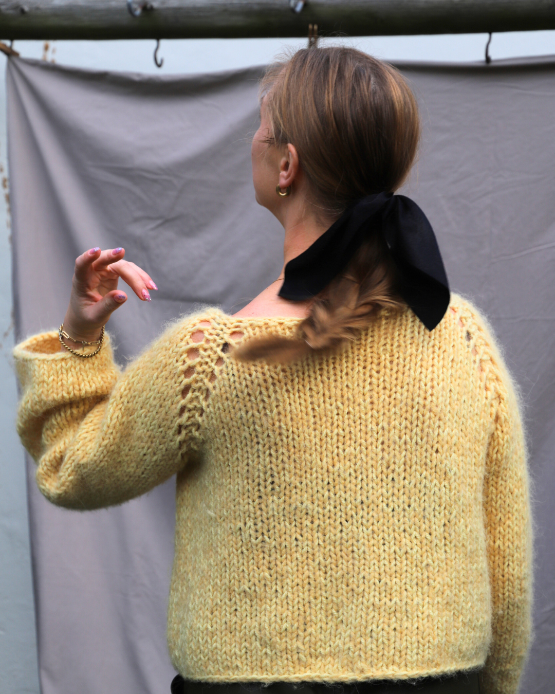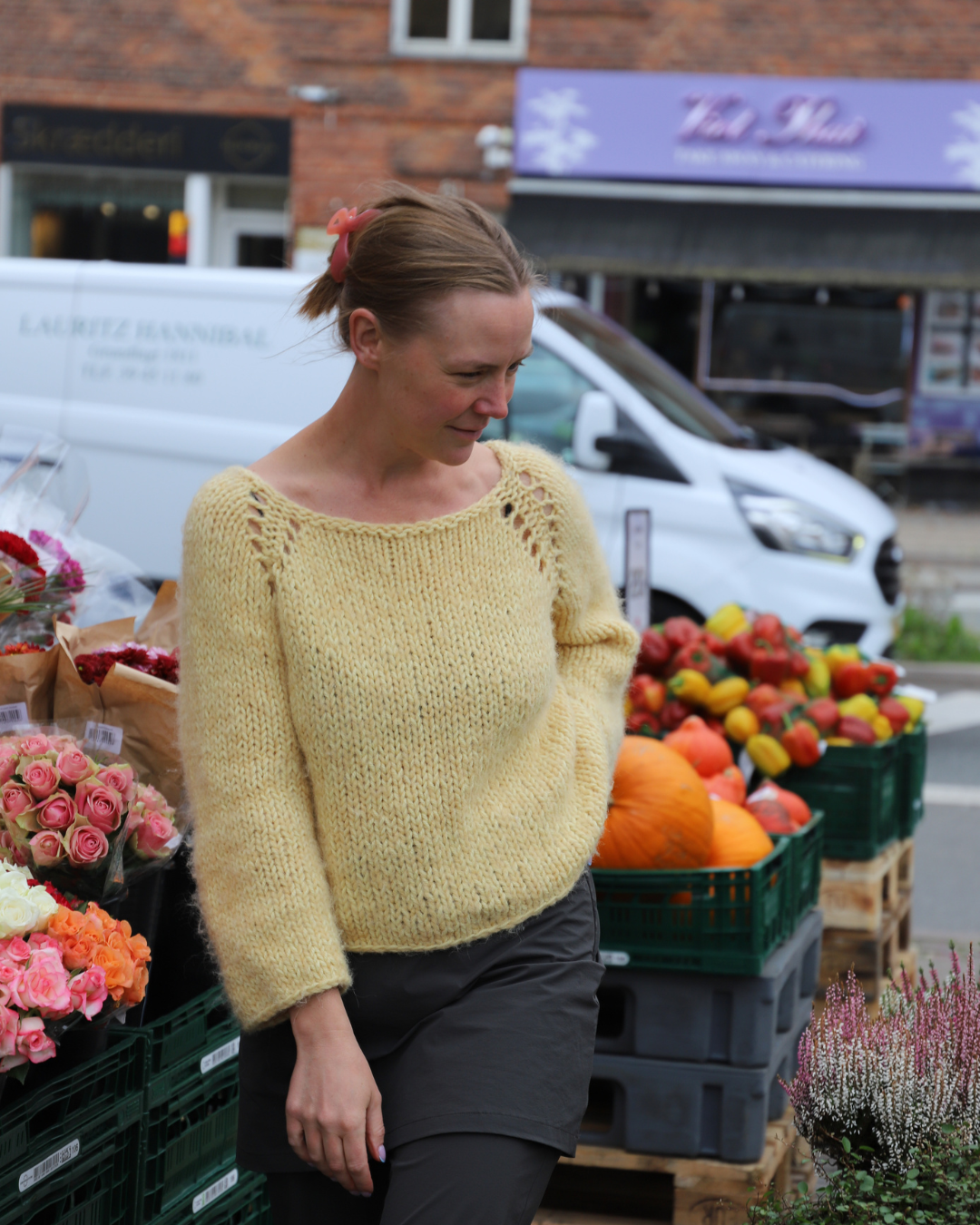 Blusen har et bevægelesrum på ca. 10 cm. Mål dig selv på det bredeste sted på brystet og læg 10 cm til dit mål. Vælg den størrelse, der ligger tættest på eller gå en størrelse ned for en mere tætsiddende version, eller en størrelse op for en løsere oversize strik.