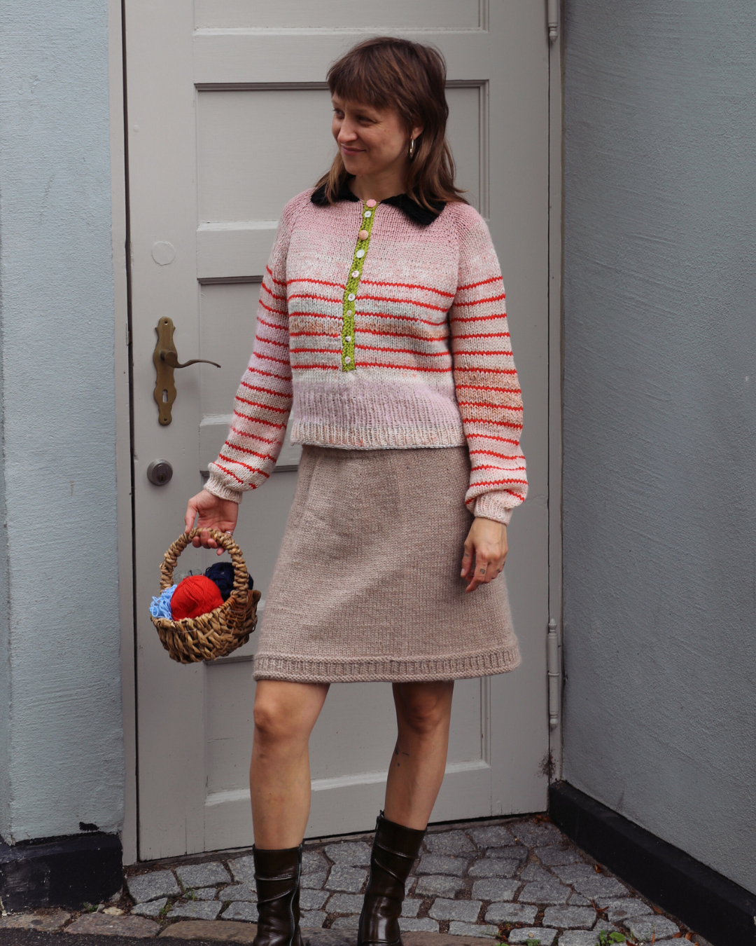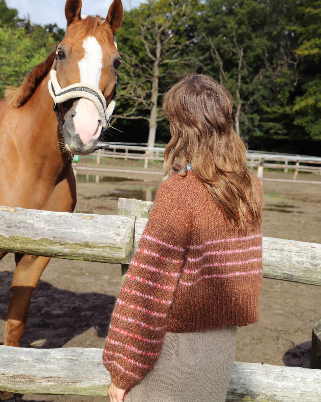 Striberne tilføjes løbende og giver et unikt, grafisk udtryk, mens ærmerne strikkes på rundpind eller med magic loop. Til sidst samles masker op til knaphulsstolper og halskanten, som du kan afslutte med en elegant Polokrave eller en enkel, hæklet kant.