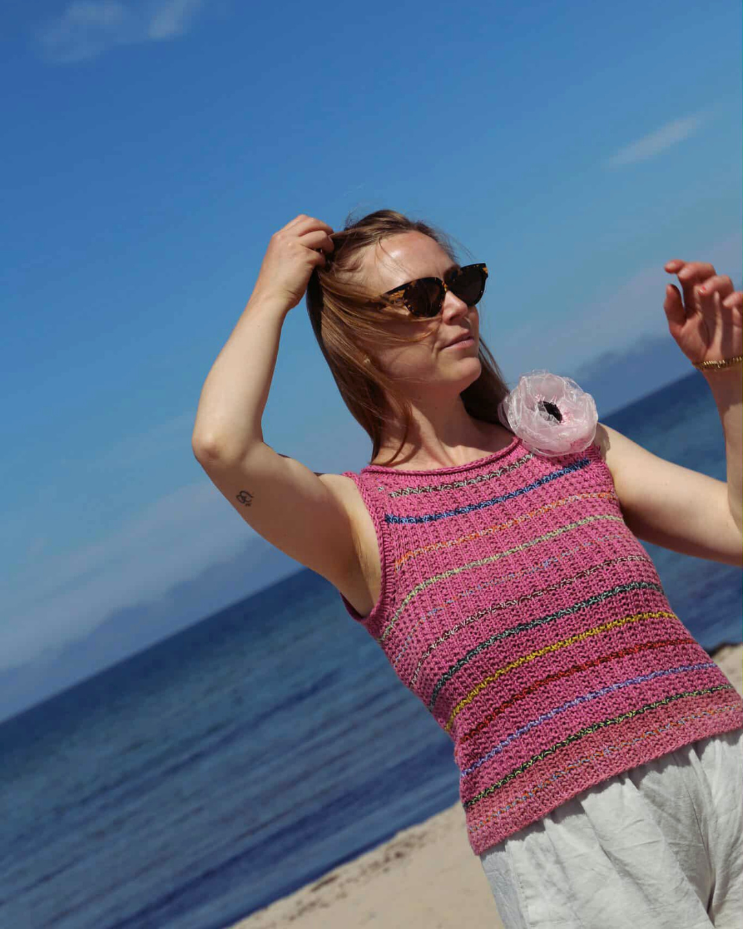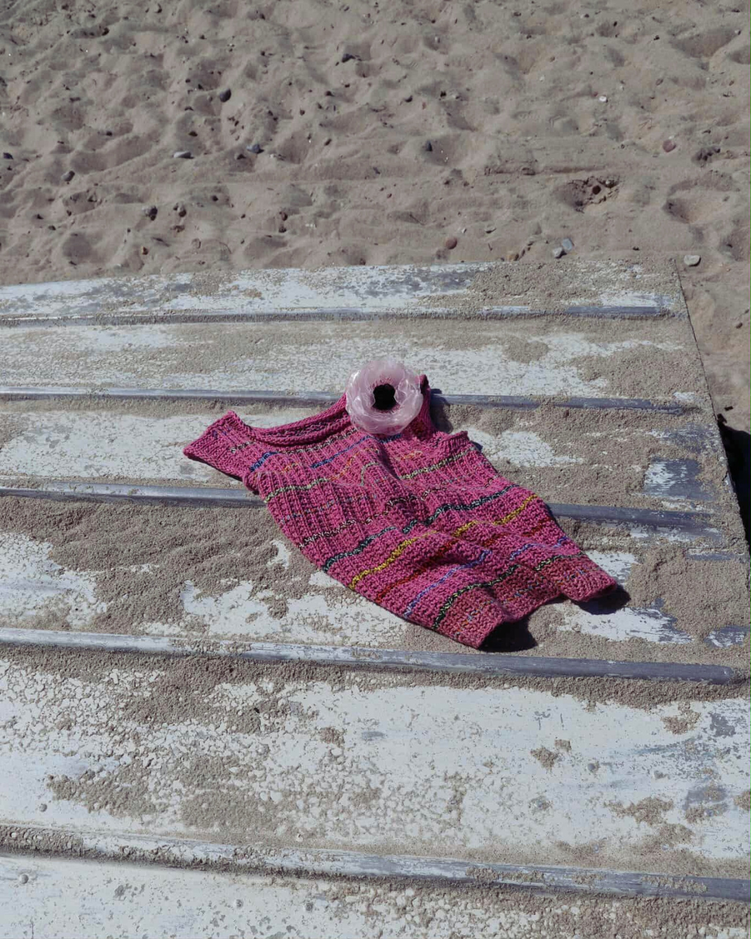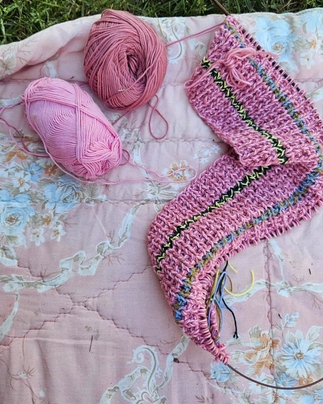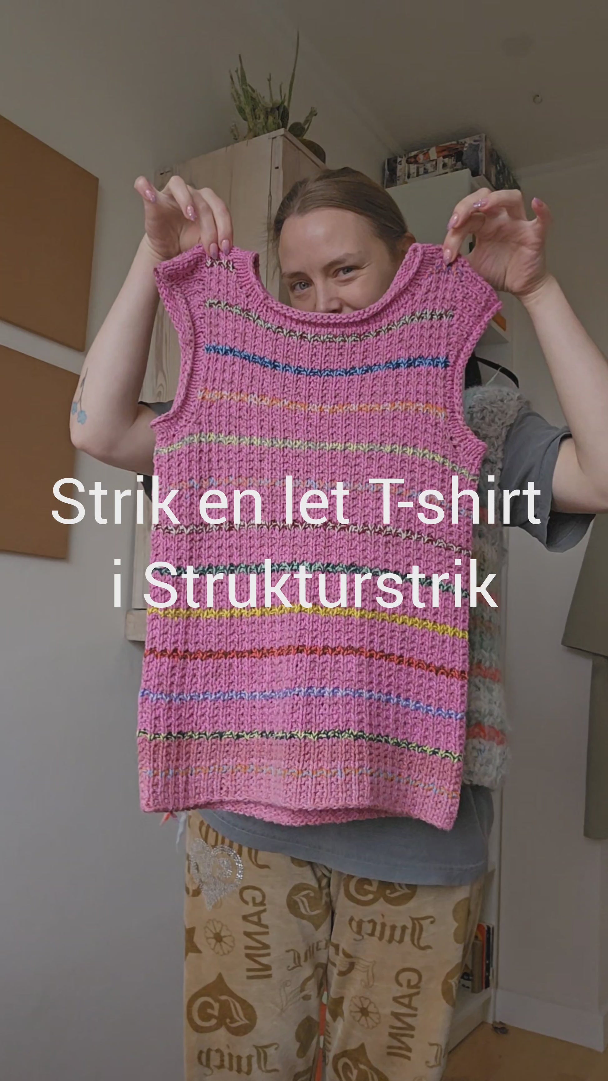 Jeg har strikket min Cotton Candy Tee i to tråde 8/4 bomuld. Jeg har brugt forskellige lyserøde/pink/rosa nuancer som grundfarve. Til striberne har jeg valgt 2 tråde garn med stor kontrast. Fx mørk blå og sart lyserød, lys gul og mørk grøn eller bordeaux og turkis.