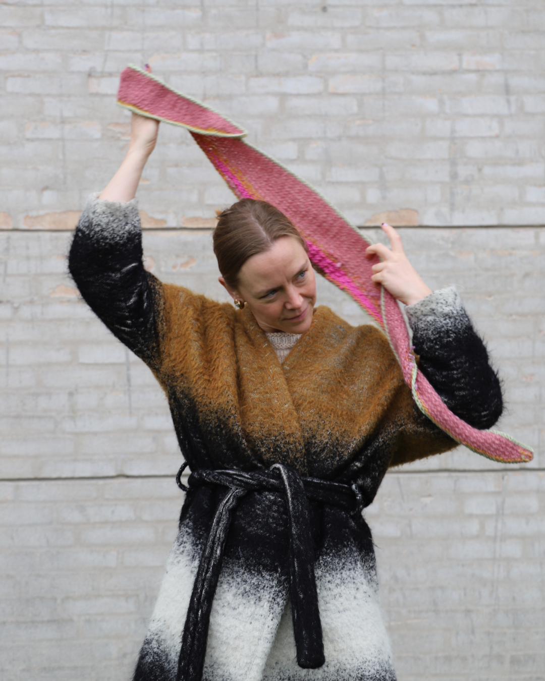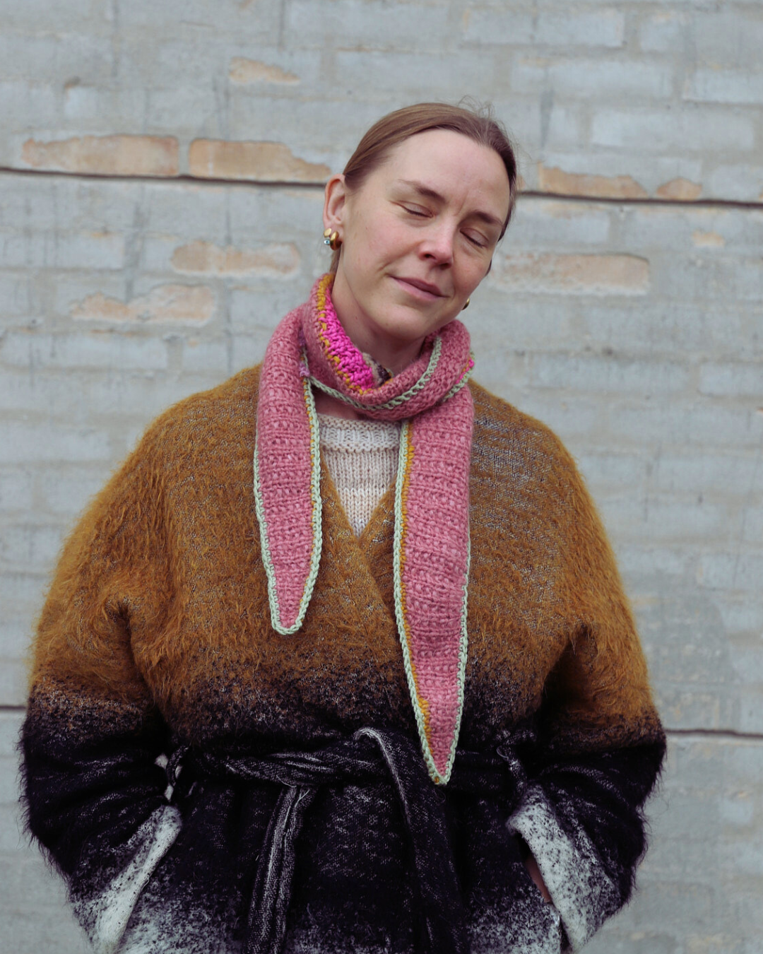 Hele arbejdet strikkes i strukturstrik, der skabes over 2 pinde. Tørklædet formes med vendepinde, så det går ned i en spids. Til sidst hækles en kant fastmasker hele vejen rundt. GARNFORSLAG