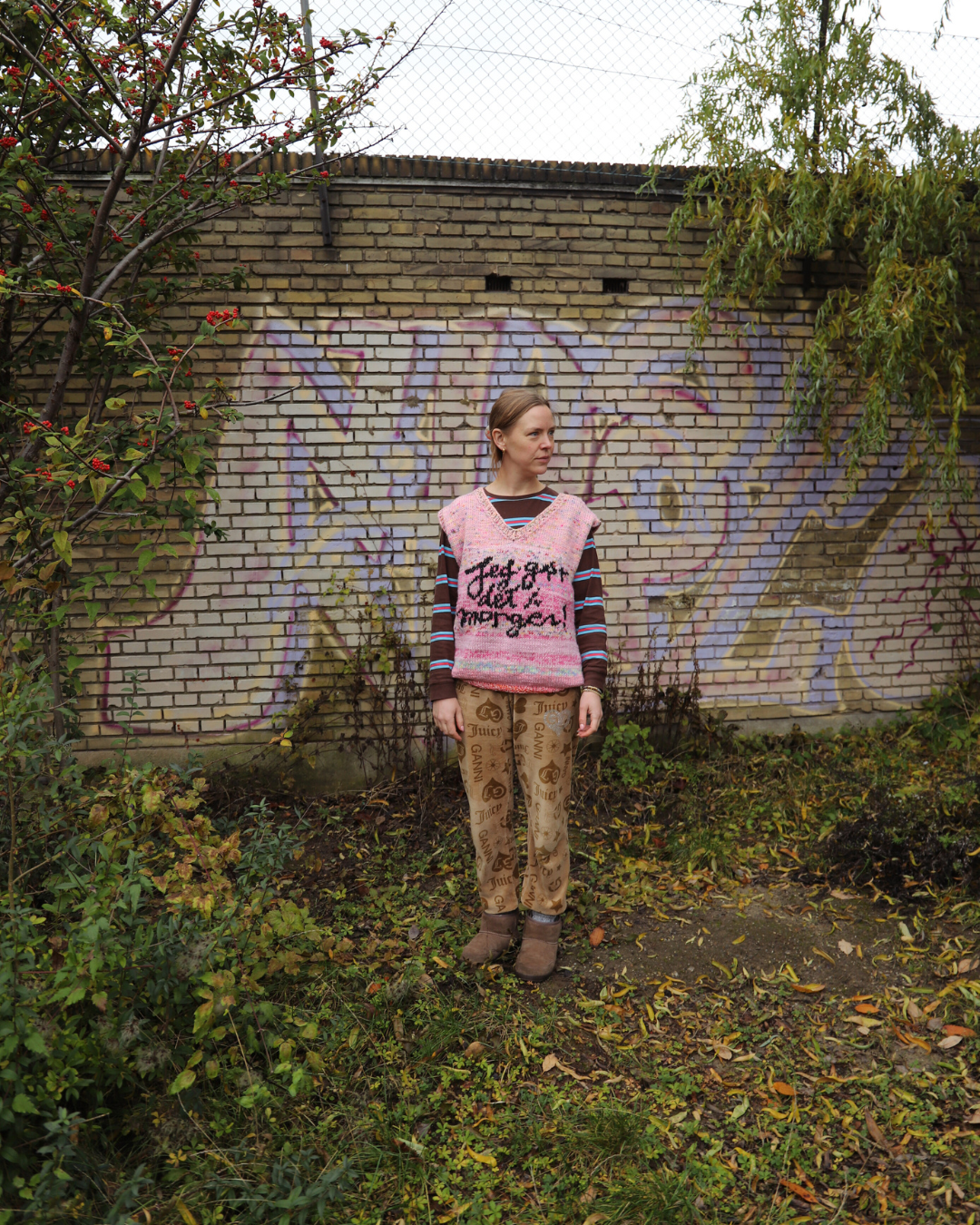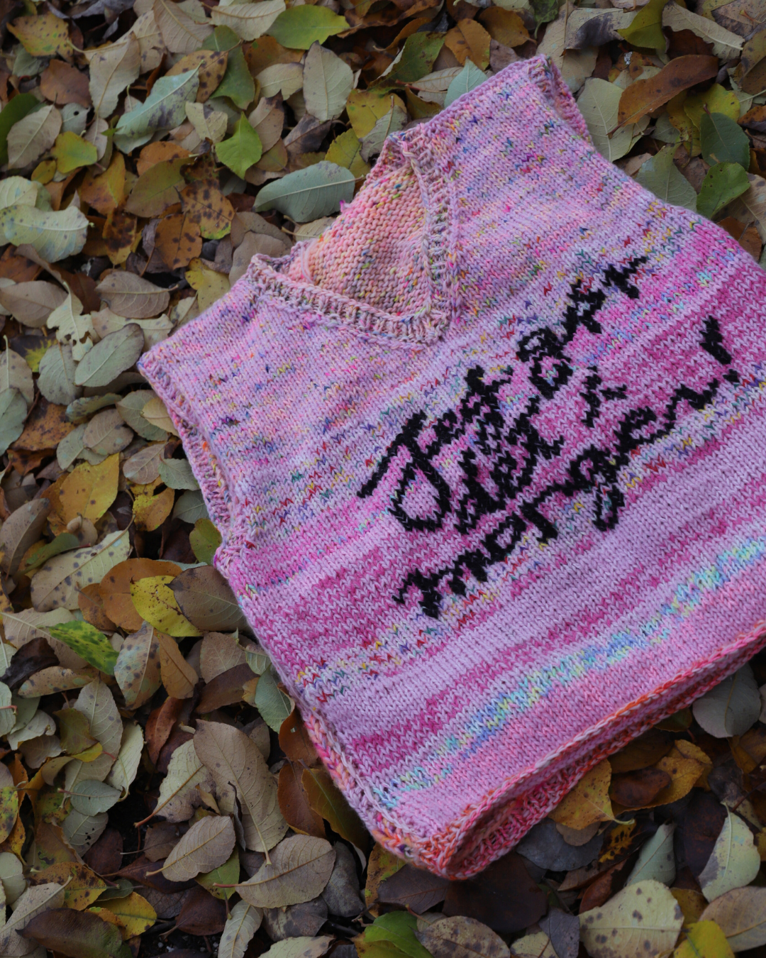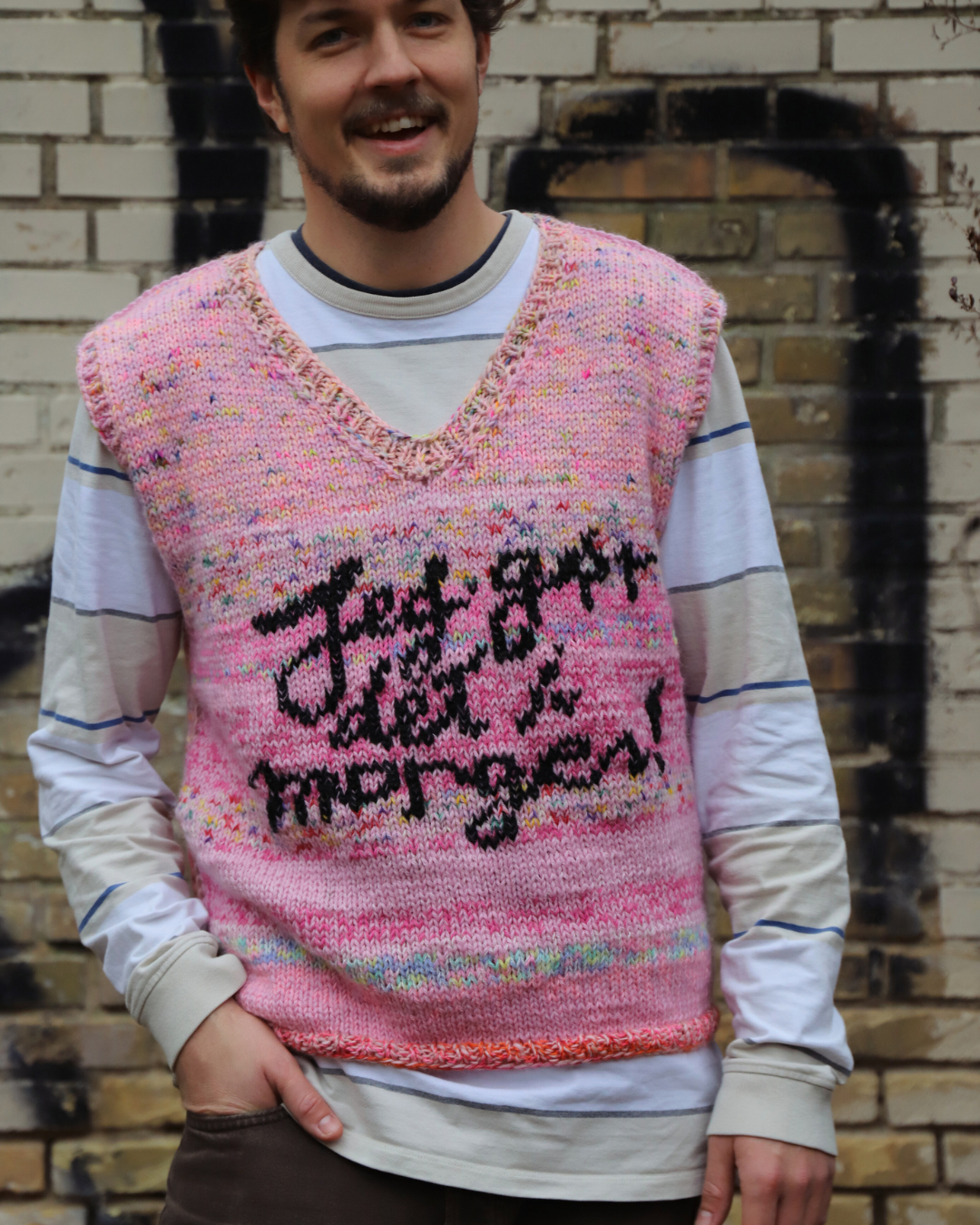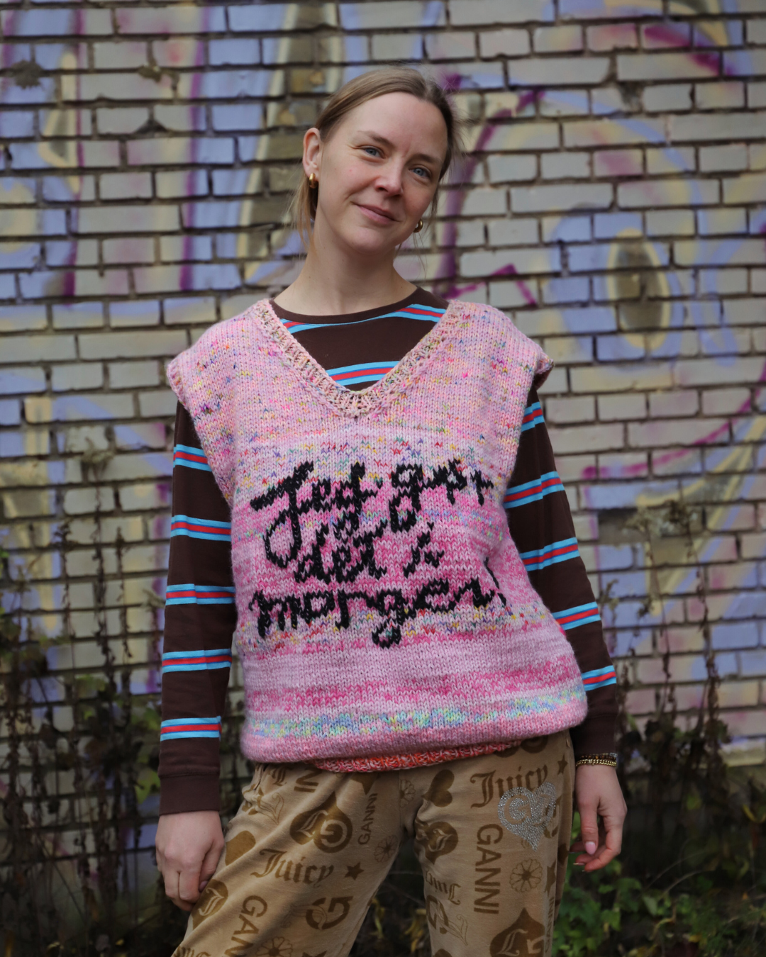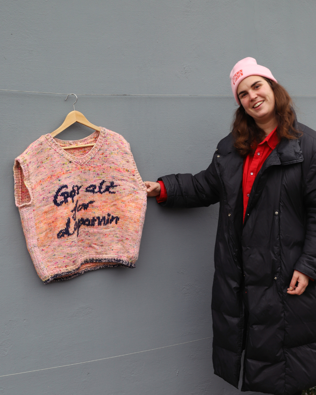 Dopa Vesten er blevet til i samarbejde mellem Frejasknit og Dopaminklubben. Broderiet på forstykket er skabt med udgangspunkt i en tegning af Anders Morgenthaler.