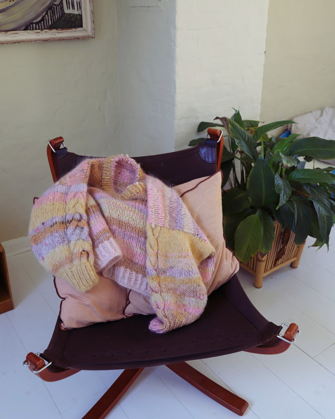 Ærmerne strikkes ved at samle masker op langs ærmegabet. Ærmerne har en flot snoning og afsluttes med en bred ribkant.