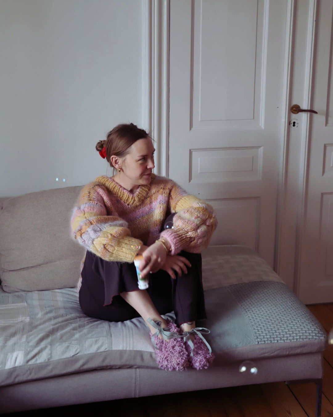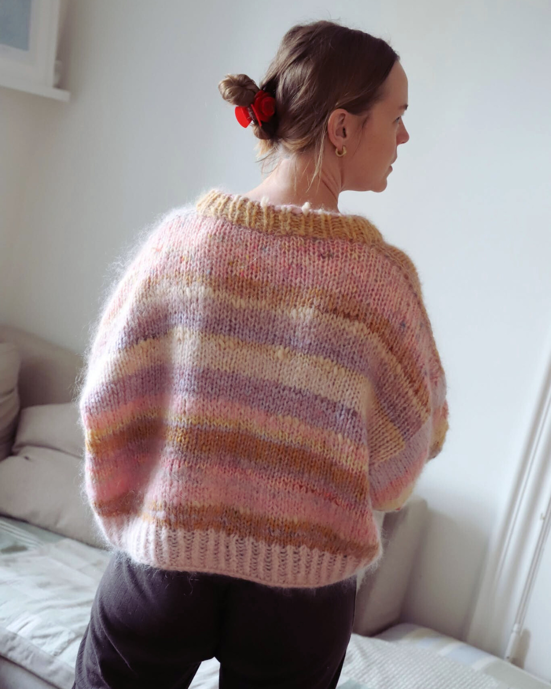 OMG Sweater er designet med et afslappet, boxy fit og brede ærmer med snoninger og V-hals. Den strikkes oppefra og ned i glatstrik.