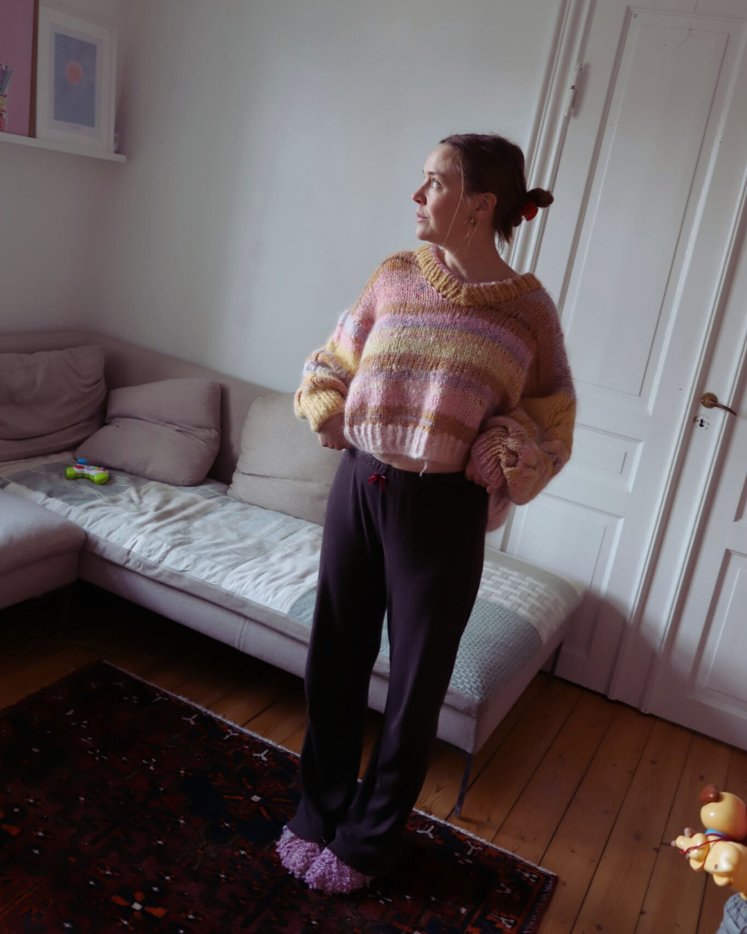 De angivne mål er sweaterens færdige mål, og modellen er tiltænkt et bevægelsesrum (positive ease) på mindst 30 cm, som giver et løst og afslappet look - vær opmærksom på arbejdets færdige mål, når du vælger størrelse! Mål dig selv på det bredeste sted på brystet og sammenlign med de færdige mål.