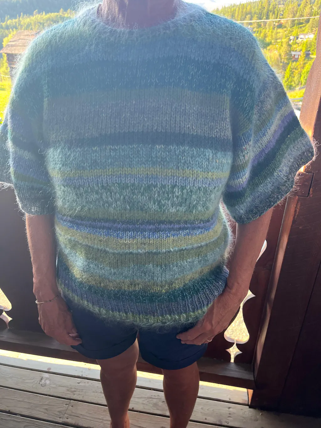 Jeg har så mange rester uldgarn i forskellig tykkelse. Valgte blå og grønne nuancer, lavede en strikkeprøve og før jeg fik set mig om, var den lækreste uldtrøje med korte ærmer af pinden. Opskriften var supernemt og lige til, og trøjen er perfekt til de kølige sommeraftener.