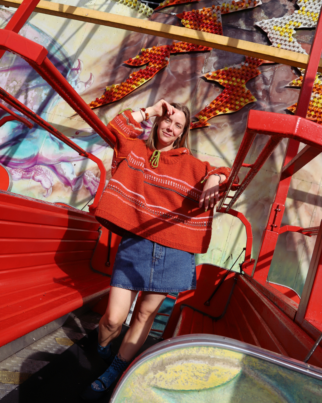 Den røde sweater er strikket i Nepal fra Drops farvekode 2920