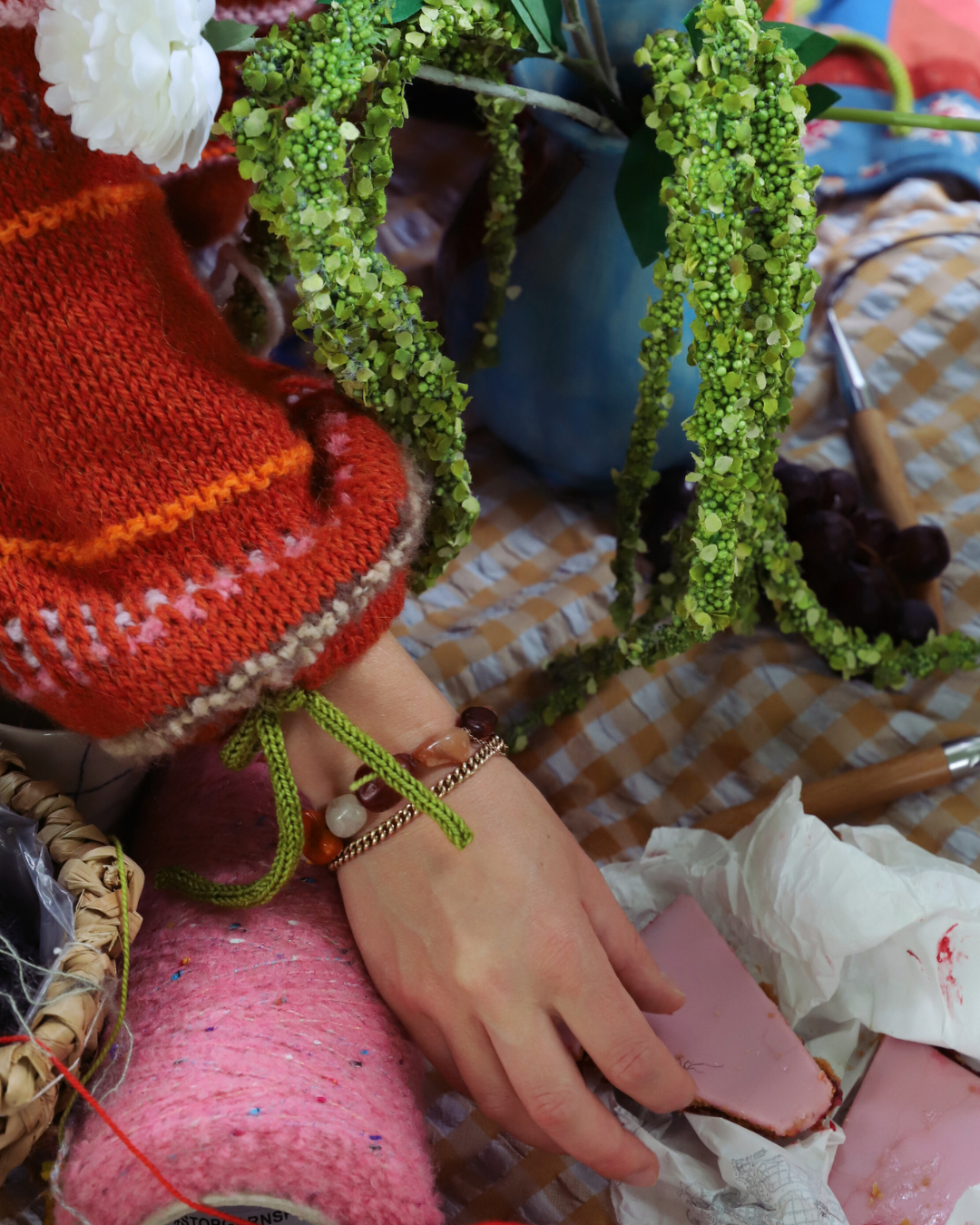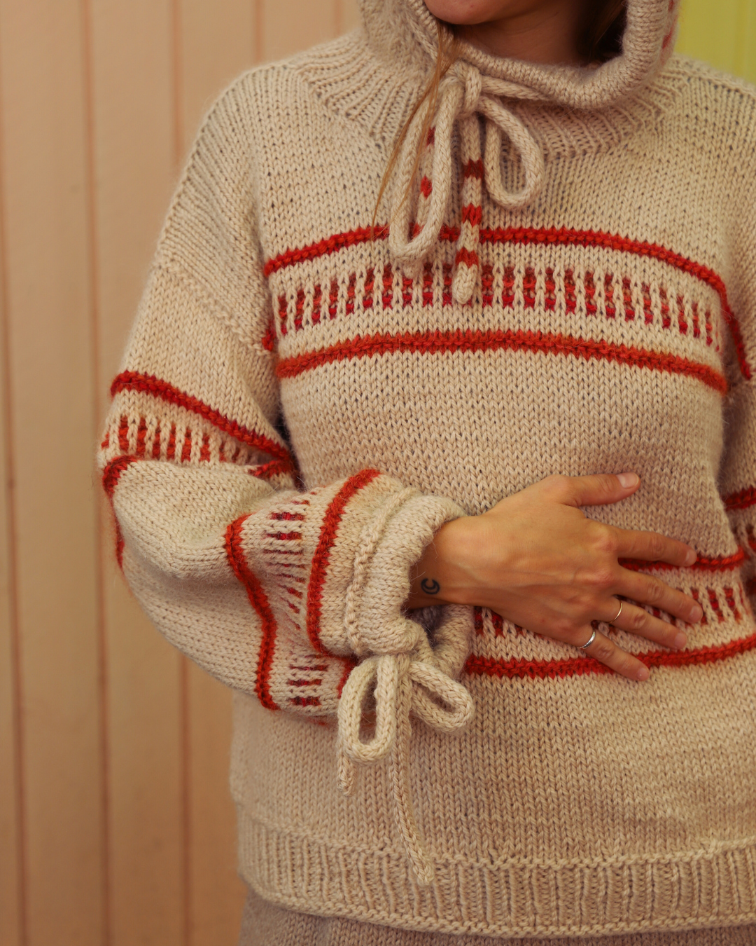 Til sidst strikkes ærmerne, ved at samle masker op langs kroppen. Ærmerne afsluttes med en løbegang og snor, som gør det muligt at justere bredden på håndleddet.