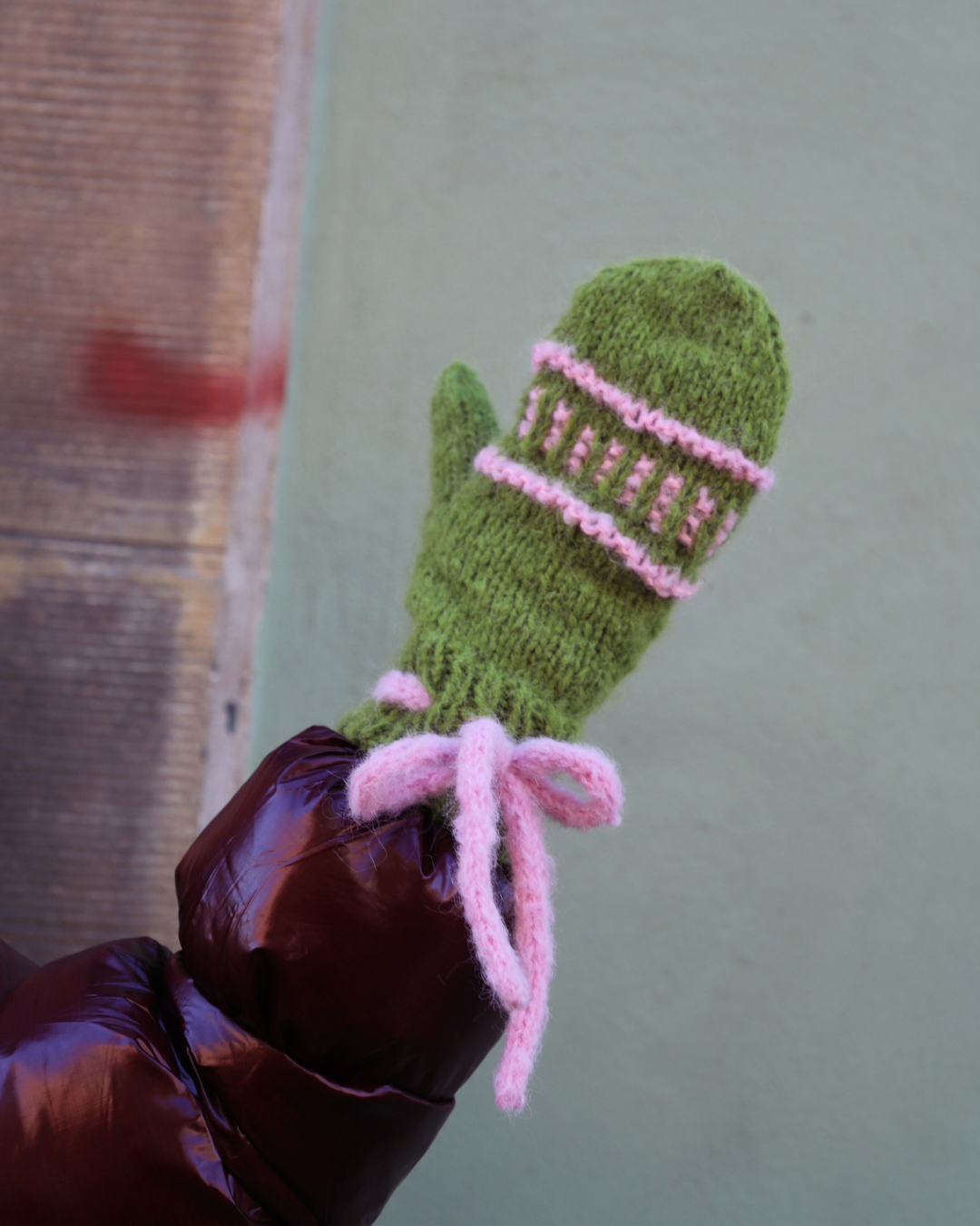 Først strikkes ribben med huller. Derefter strikkes det nederste af hånden. Så strikkes en kontrasttråd ind, hvor tomlen skal sidde, hvorefter strukturen og toppen strikkes. Der tages i begge sider langs den øverste del af vanten, hvorefter der lukkes af i toppen. Herefter samles der masker op til tomlen, tomlen strikkes på strømpepinde, og til sidst strikkes der en icord snor til håndleddet.