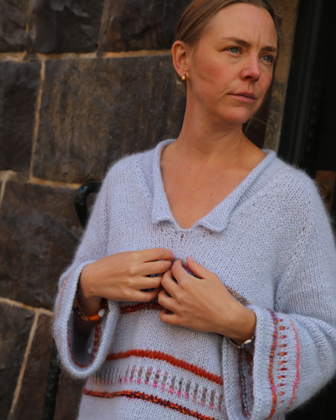 Første del af arbejdet strikkes frem og tilbage med vendepinde for at gøre blusen højere i nakken. Derefter laves der raglanudtagninger og udtagninger foran for at forme v-halsen. Derefter samles arbejdet og der strikkes rundt indtil ærmegabet, hvorefter krop og ærmer strikkes færdige hver for sig. På krop og ærmer strikkes der strukturstrik i kontrastfarve. Ærmerne er let trompetformede. Til sidst samles der masker op langs halsen, og kraven strikkes frem og tilbage med vendepinde i nakken og udtagninger for at forme spidserne.