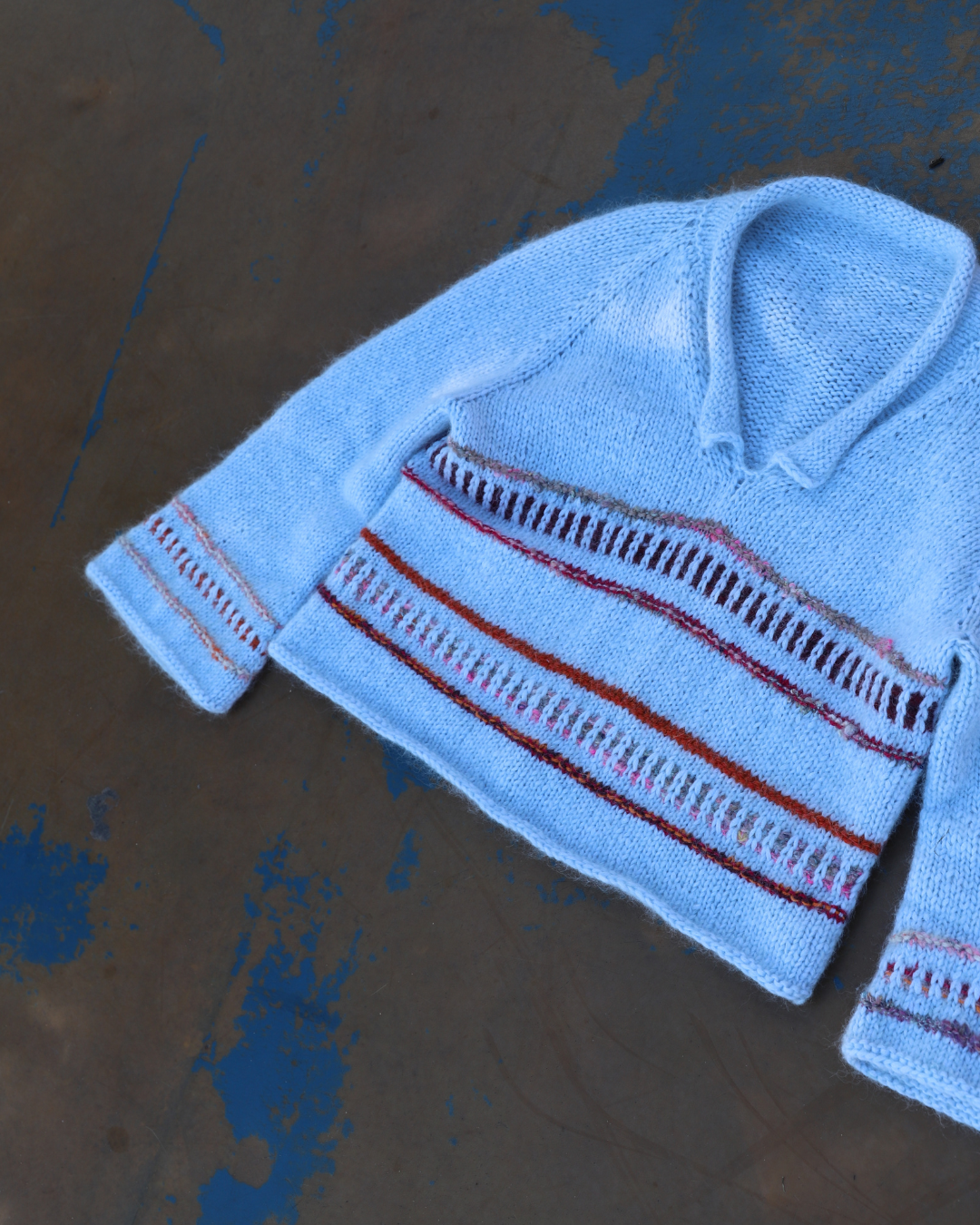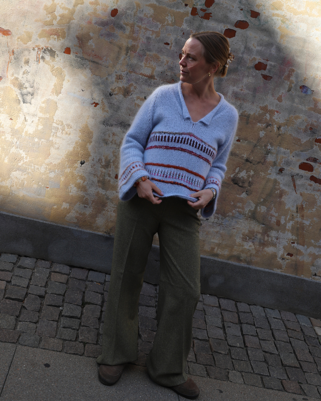 OM ARBEJDET Playful V-neck strikkes oppefra og ned med raglanudtagninger, vendepinde, og udtagninger til v-hals.