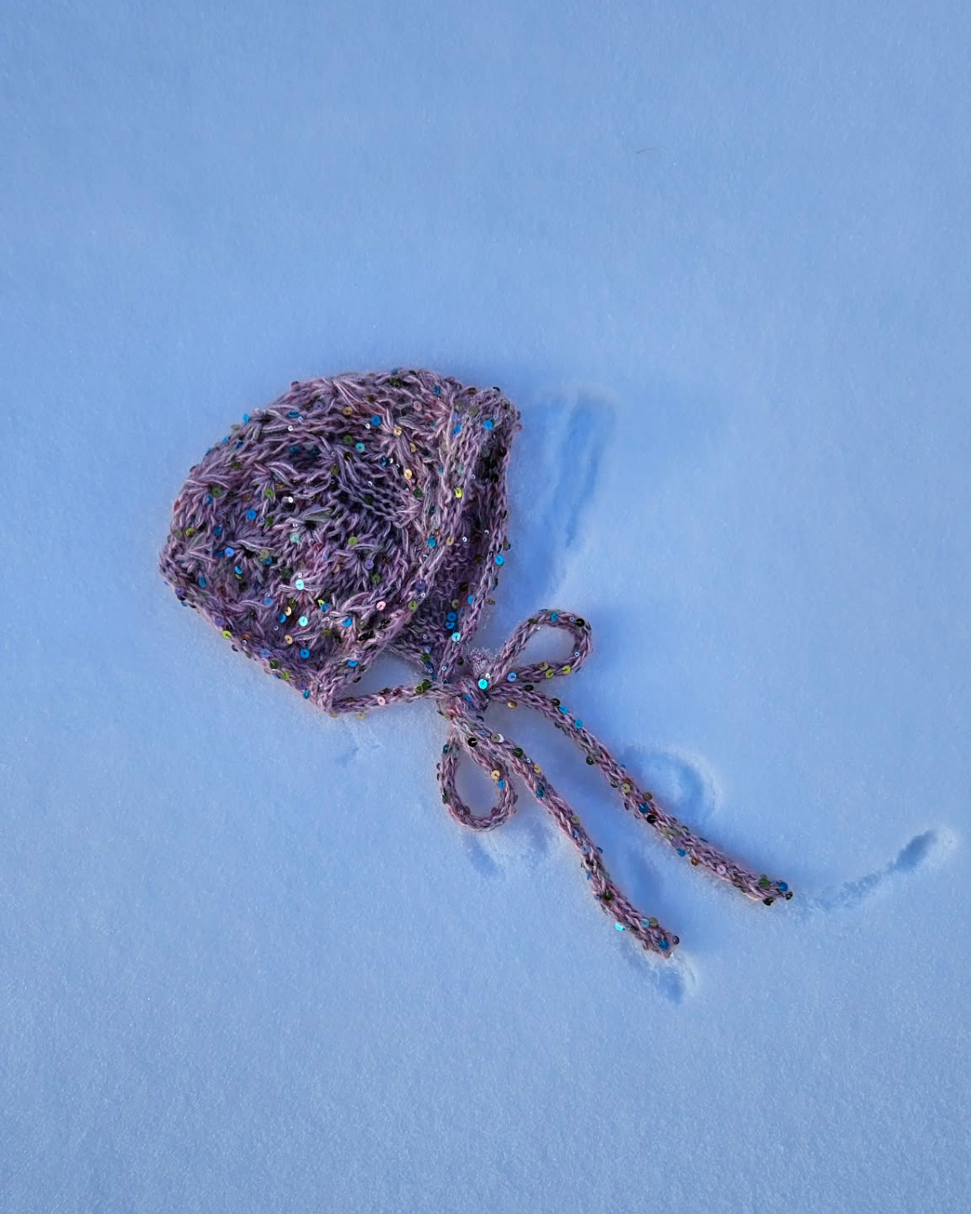 25 g Melody fra Drops, 71% Alpaca, 25% Uld, 4% Polyamid, 50 g = ca. 140 meter sammen med 25 gram Paljett fra Sandnes, 55% bomuld, 45% polyester 50 gram =140 meter