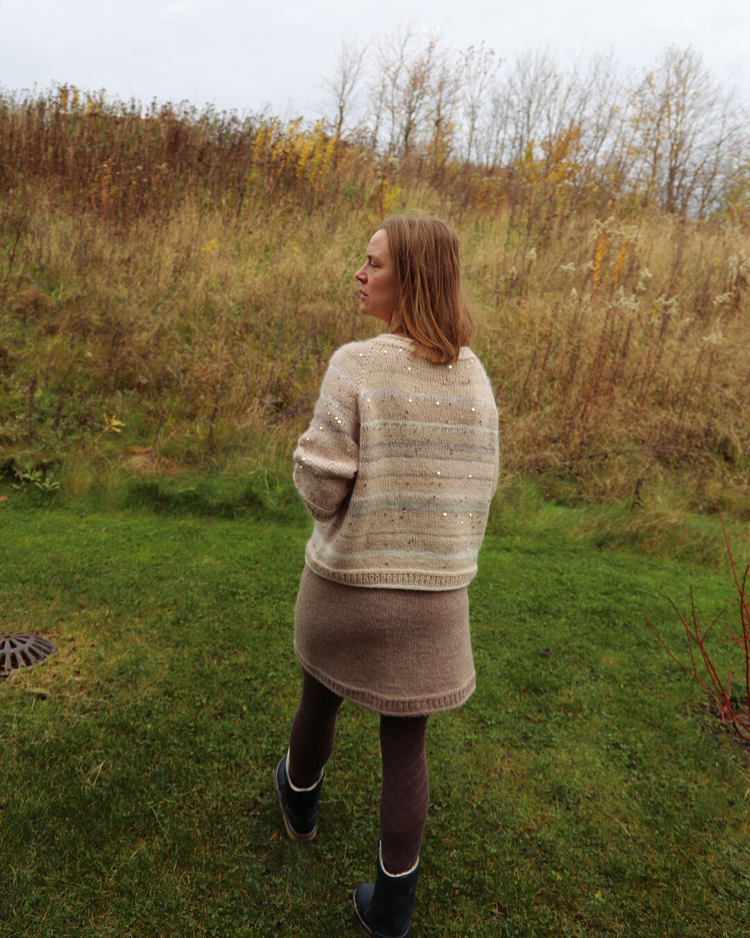 Den beige og hvide bluse på billederne er strikket i et miks af garnrester sammen med en tråd tyndt palliet-garn 50 gram = 140 meter. Palliet-garnet er strikket ind som striber undervejs, 1-2 omgange med palliet garn og 3-5 omgange uden.
