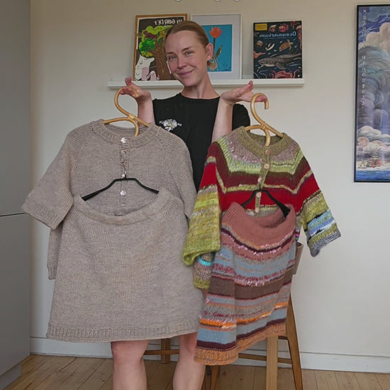 strikkes i blandede garnrester, fx i 2 tråde Sunday sammen med 1 tråd Silk Mohair. Eller Nepal fra Drops som passer perfekt i tykkelsen ifht strikkefastheden. Du kan sagtens bruge andre slags garn så længe du rammer samme strikkefasthed.