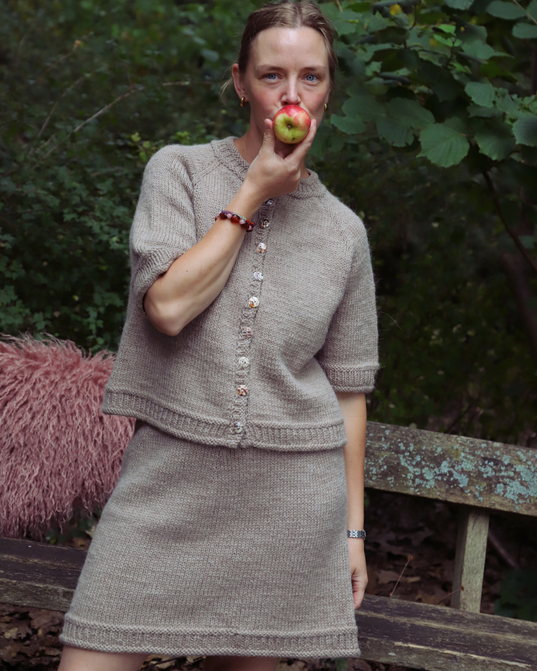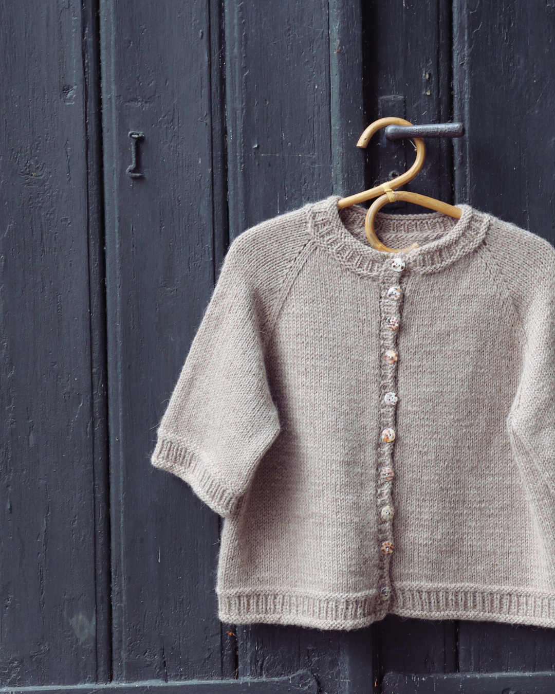 Rosemary Cardigan strikkes oppefra og ned. Først strikkes halsudskæringen, der formes med vendepinde, samtidig med at der laves raglanudtagninger.