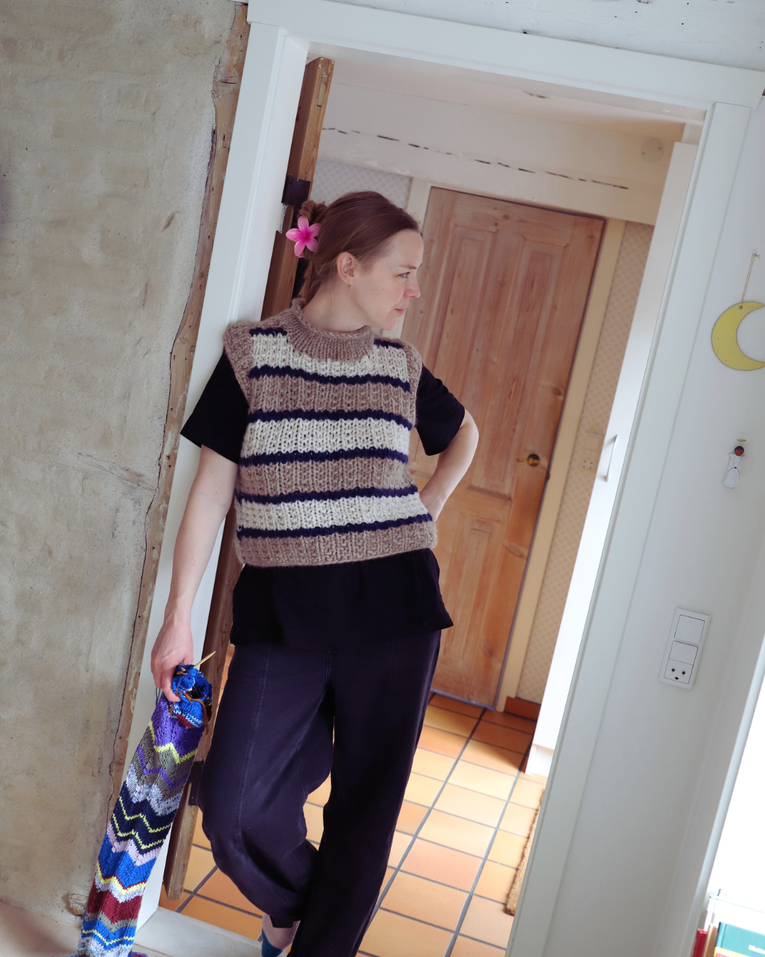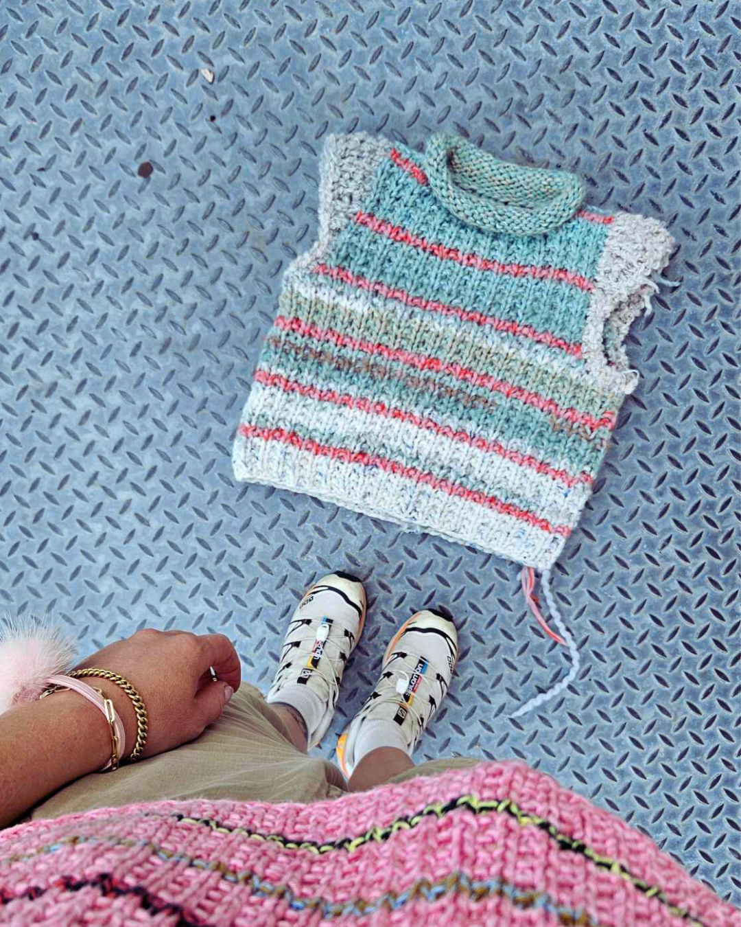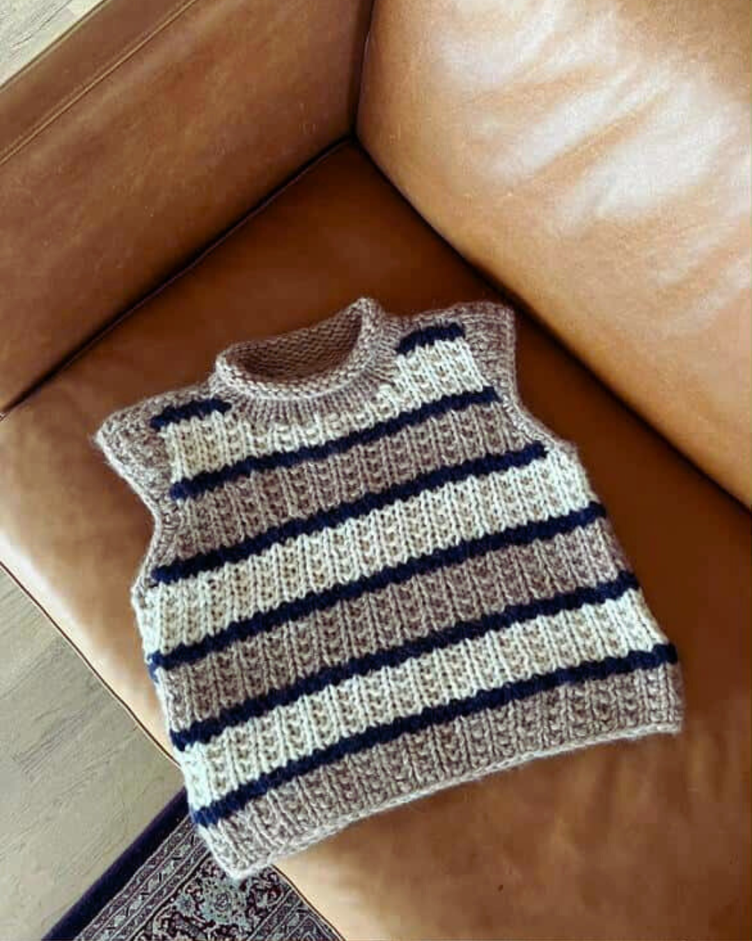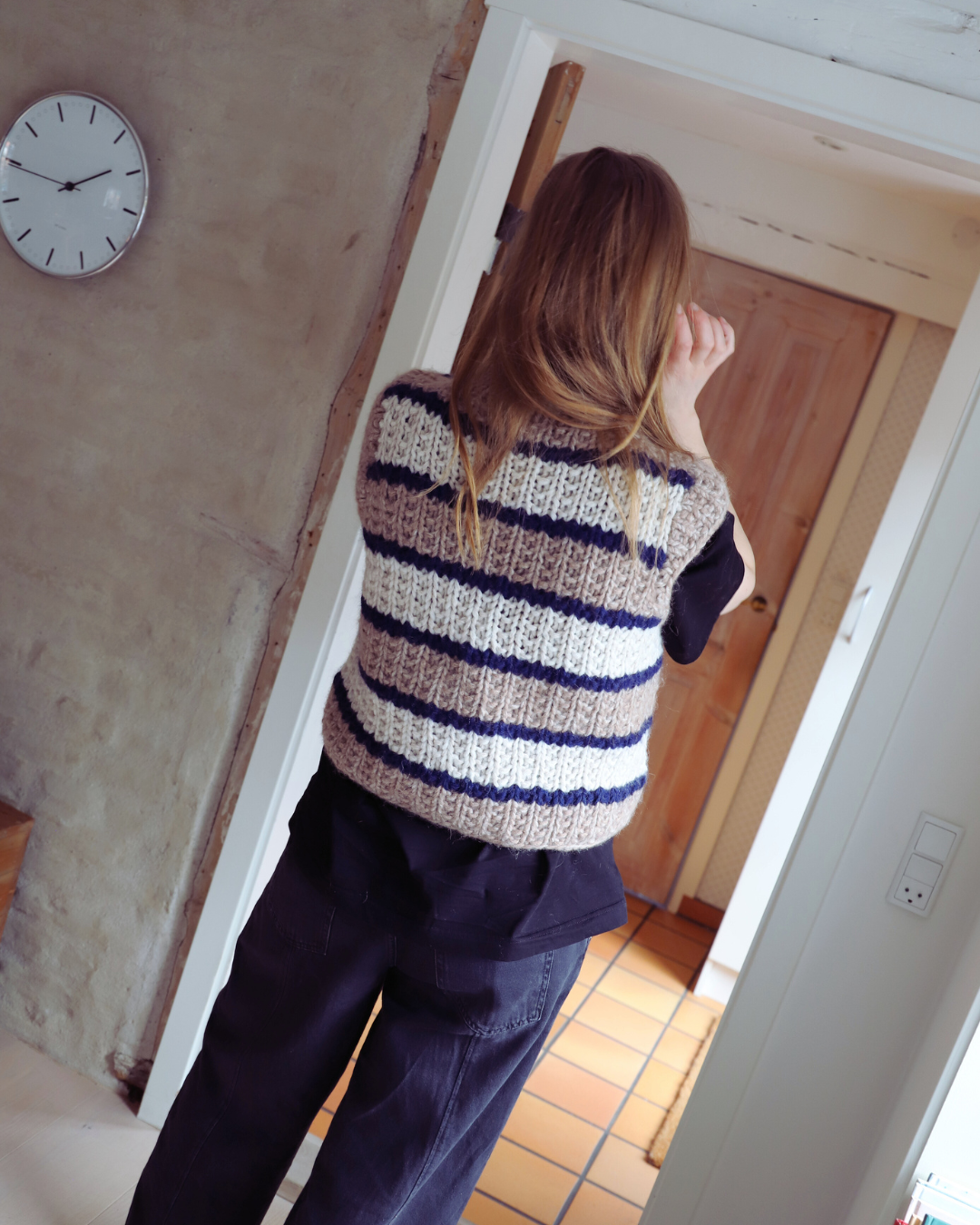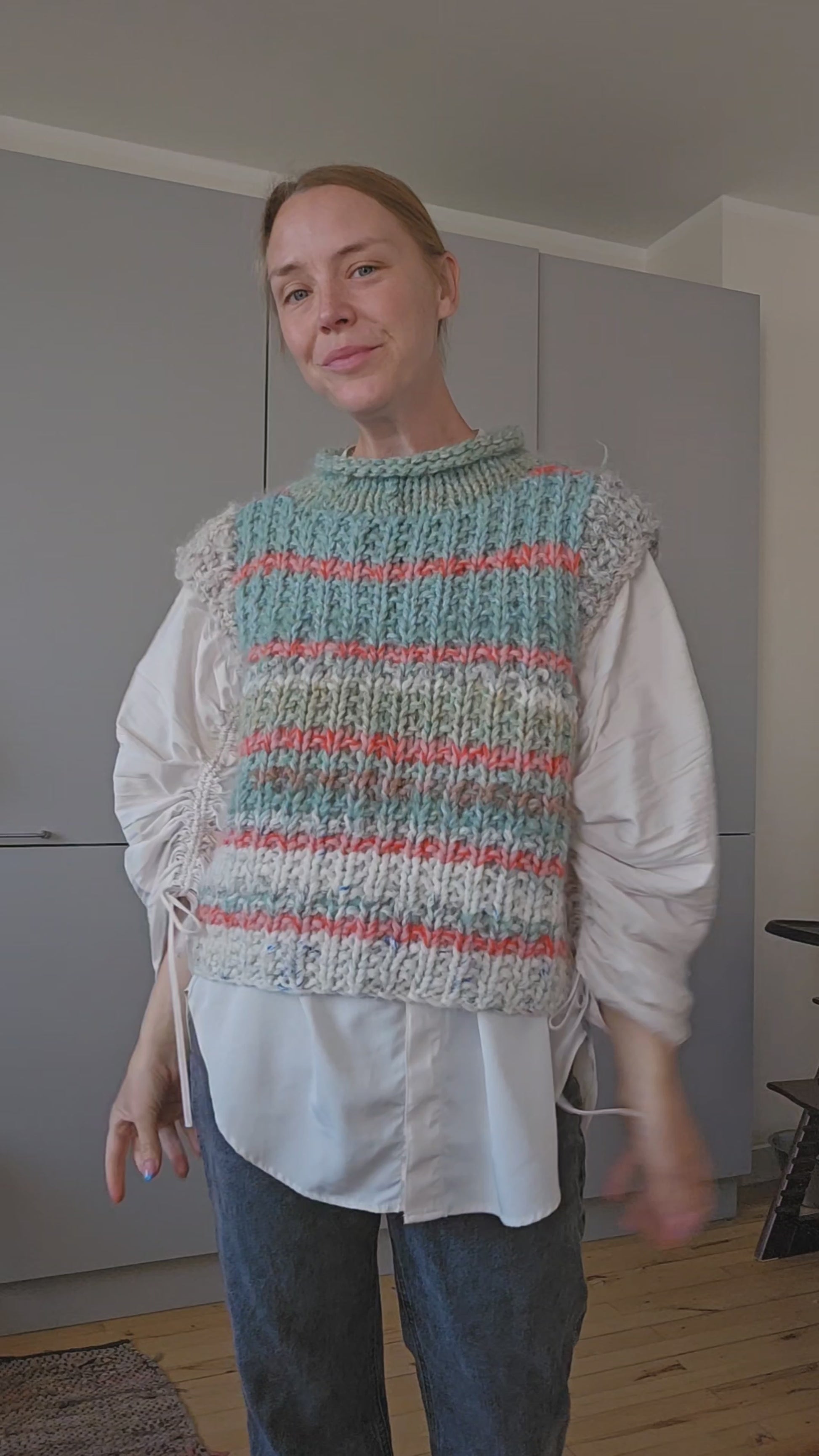 Toppen er en mellemting mellem en t-shirt og en vest. Den har små fine ærmer og halsen sluttes af med en rullekant. Den strikkes med en enkelt struktur, bestående af ret og vrangmasker, alt i alt giver det et frisk og legende udtryk, som jeg synes Shelly var det perfekte navn til.