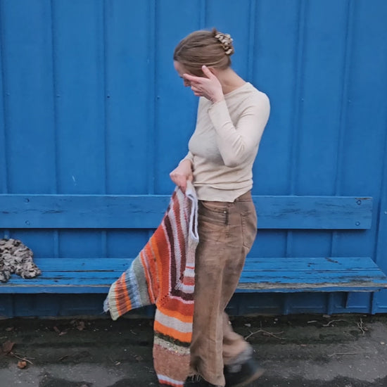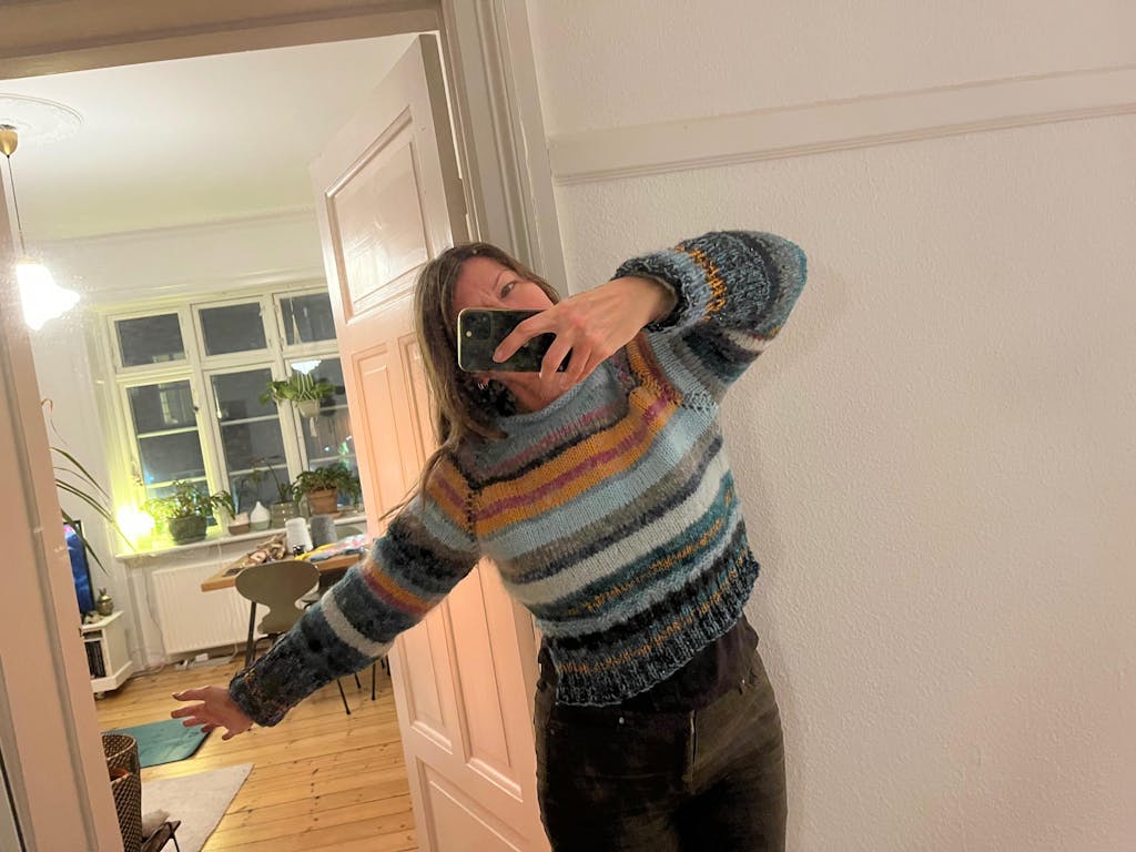 Sweateren er tænkt til at have et bevægelsesrum på ca. 10 cm. Mål dig selv på det bredeste sted på brystet og læg 10 cm til dit mål. Vælg den størrelse, der ligger tættest på eller gå en størrelse ned for en mere tætsiddende version, eller en størrelse op for en løsere oversize strik.