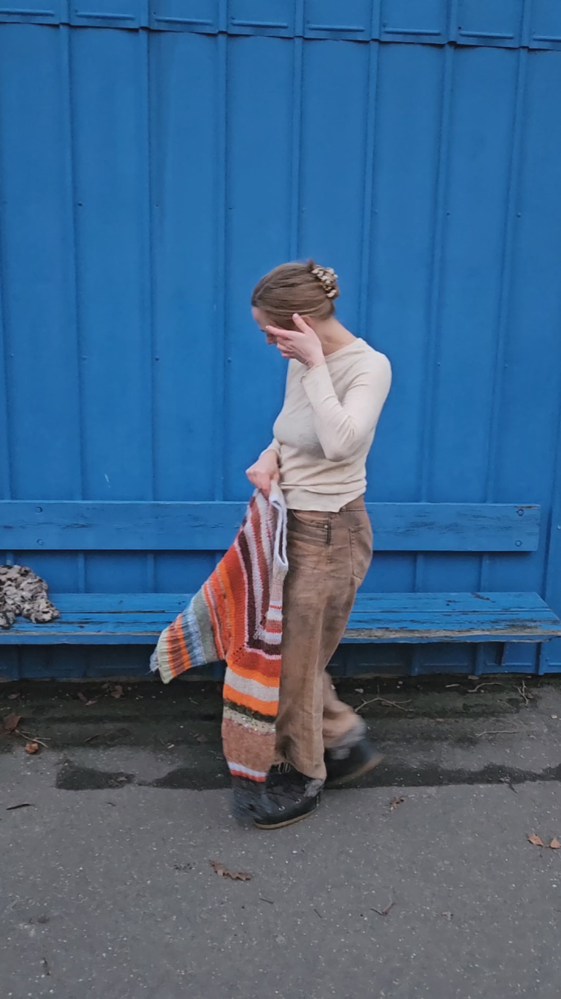 Krop og ærmer afsluttes med brede ribkanter, der strikkes med drejet ret. Ærmerne er ekstra lange og har en lille åbning til at strikke tommelfingeren igennem. Ribben på kroppen strikkes splittet, og bagstykket strikkes længere end forstykket. Afslutningsvis samles der masker op langs halsen, på pind 5, og kraven strikkes på.