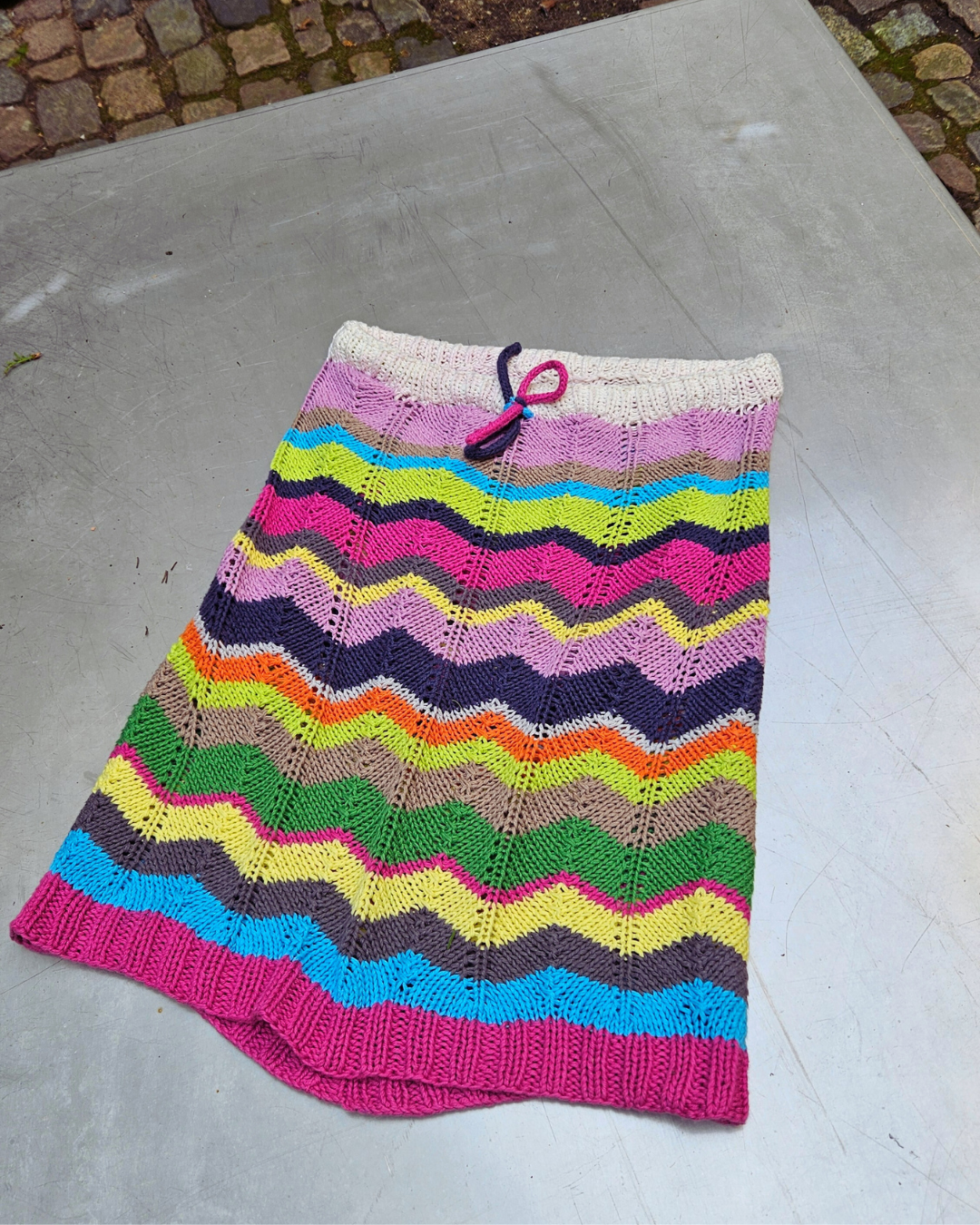 Nederdelen strikkes oppefra og ned på pind 5 i et enkelt zig-zag mønster. Der strikkes med 2 tråde 8/4 bomuldsgarn - eller lignende.