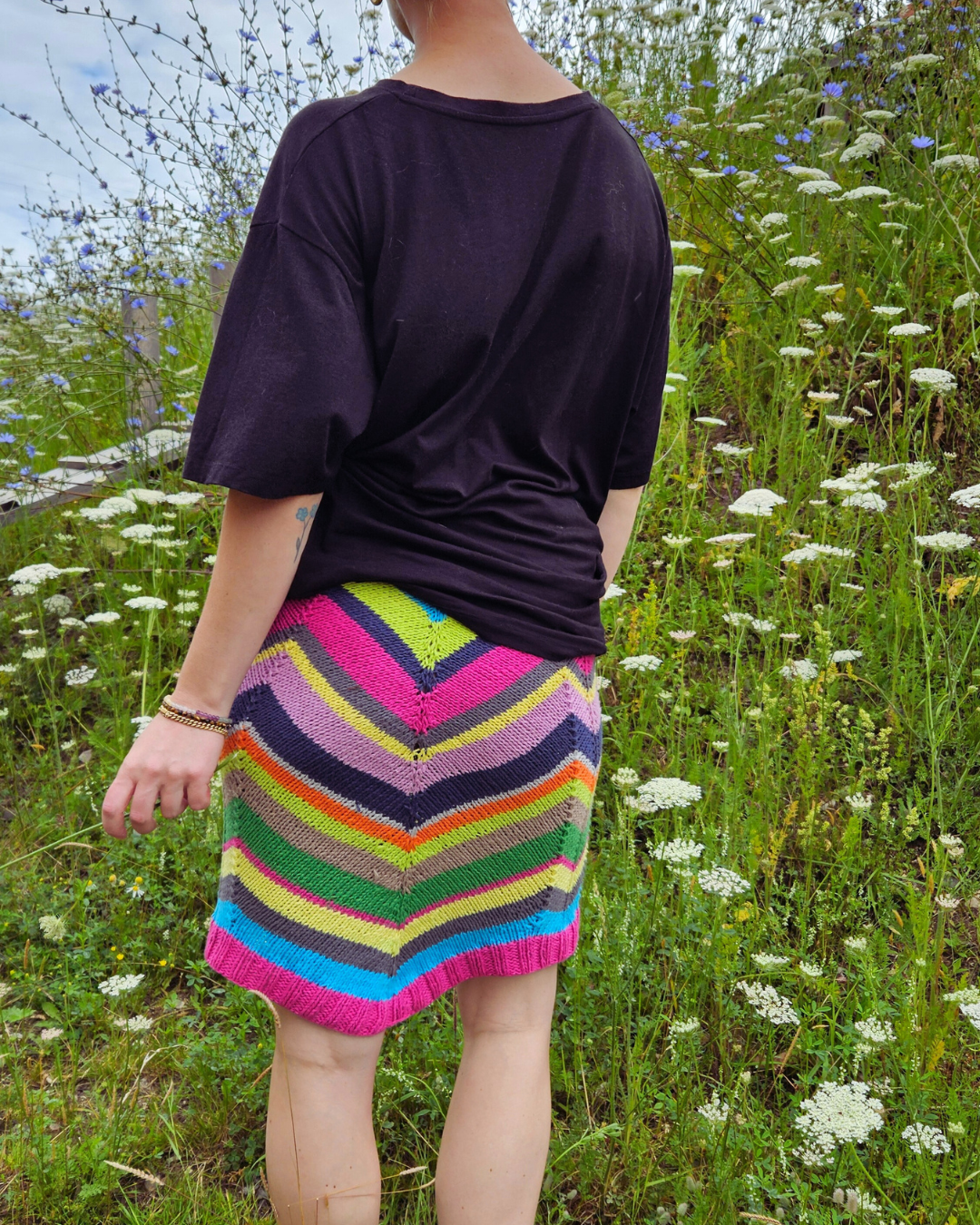 Hele arbejdet strikkes rundt. Først strikkes ribkanten langs linningen. Herefter strikkes der vendepinde for at gøre nederdelen højere bagpå. Efterfølgende laves der udtagninger midt bagpå. Udtagninger bagpå gør at mønsteret ser anderledes ud bagpå end foran, og de er med til at give en flot pasform og timeglas effekt. Derefter strikkes der rundt, og nederdelen afsluttes med en ribkant og italienskaflukning. Kanten langs linningen bukkes ind og sys fast på vrangsiden efter elastikken er trukket igennem.